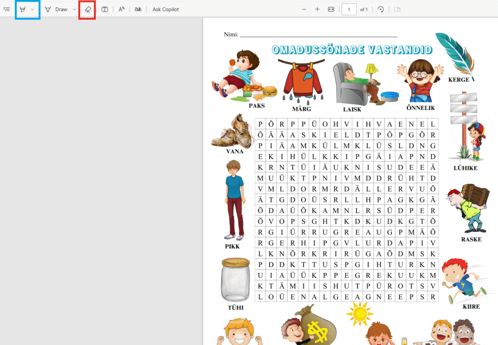 Juhul, kui tegid midagi valesti või tahad muuta, siis saad valesti tehtu ka kustutada kasutades kustutuskummi (vt pildil märgistatud punasega).
