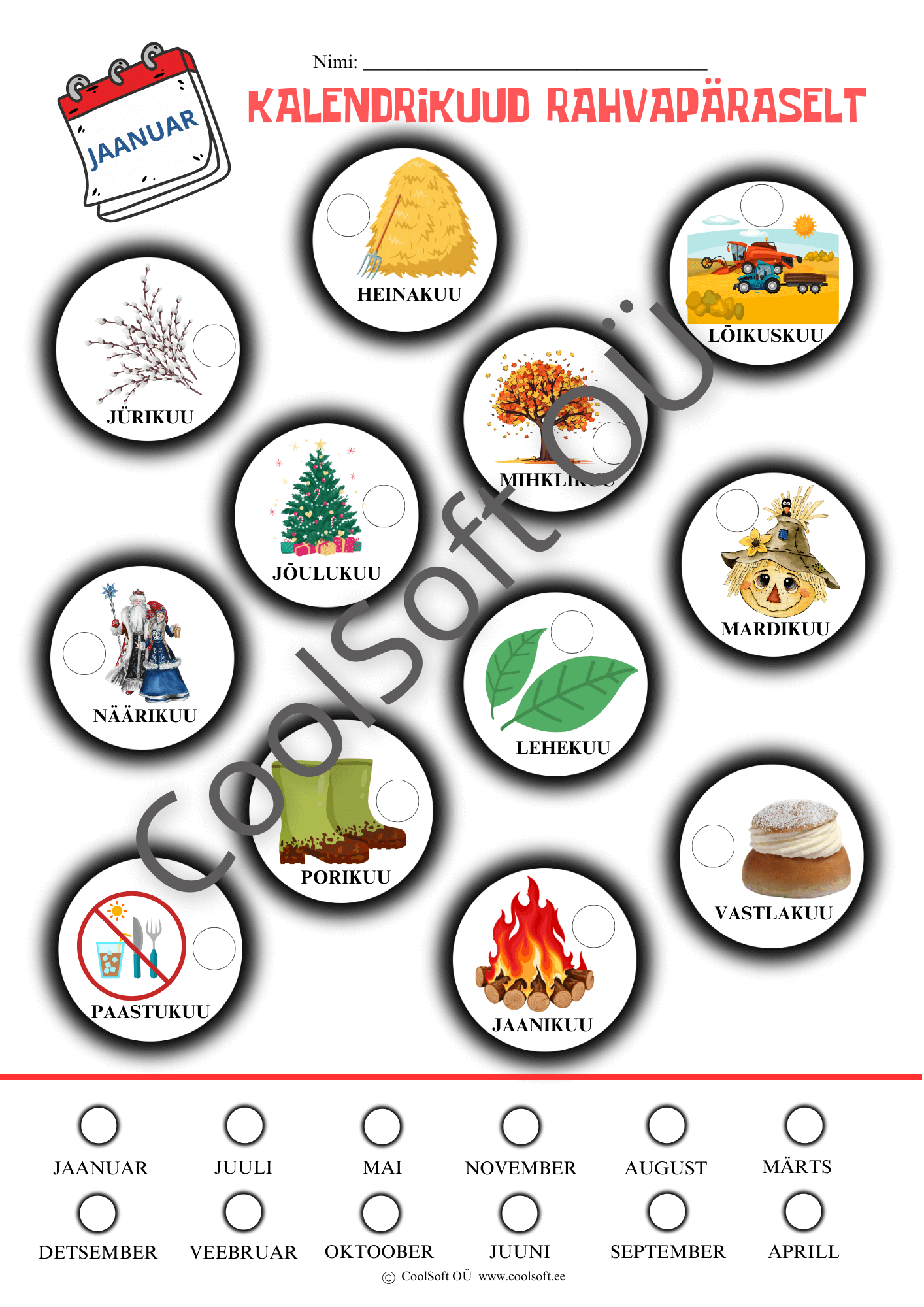 Kuidas nimetatakse kalendrikuid rahvapäraselt? Kirjuta esmalt lehe all olevas osas märgitud kalendrikuude ette iga kuu järjekorranumber aastas- näiteks jaanuar- 1. Seejärel tee kindlaks kuidas nimetati jaanuarikuud rahvapäraselt ning kirjuta antud pildi juures olevasse ringi jaanuarikuu järjekorranumber- 1.