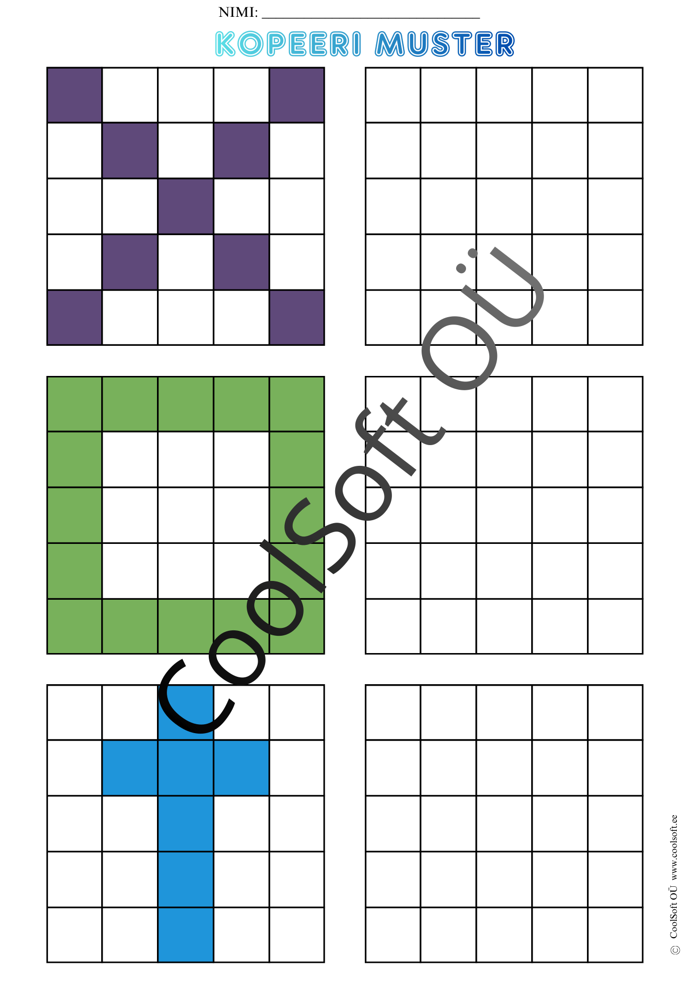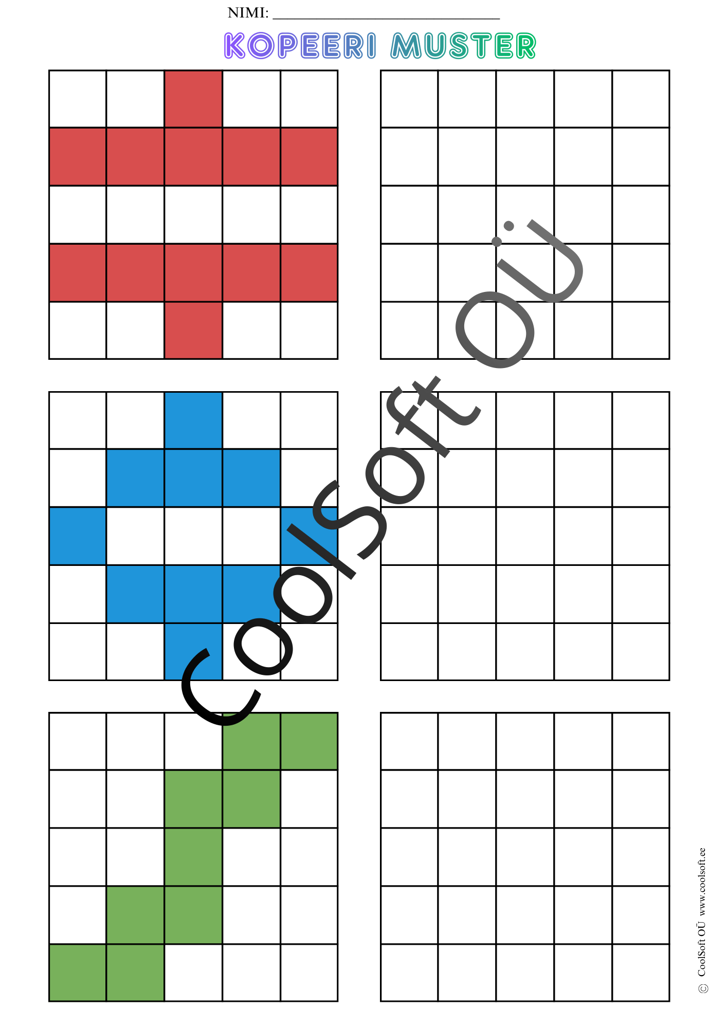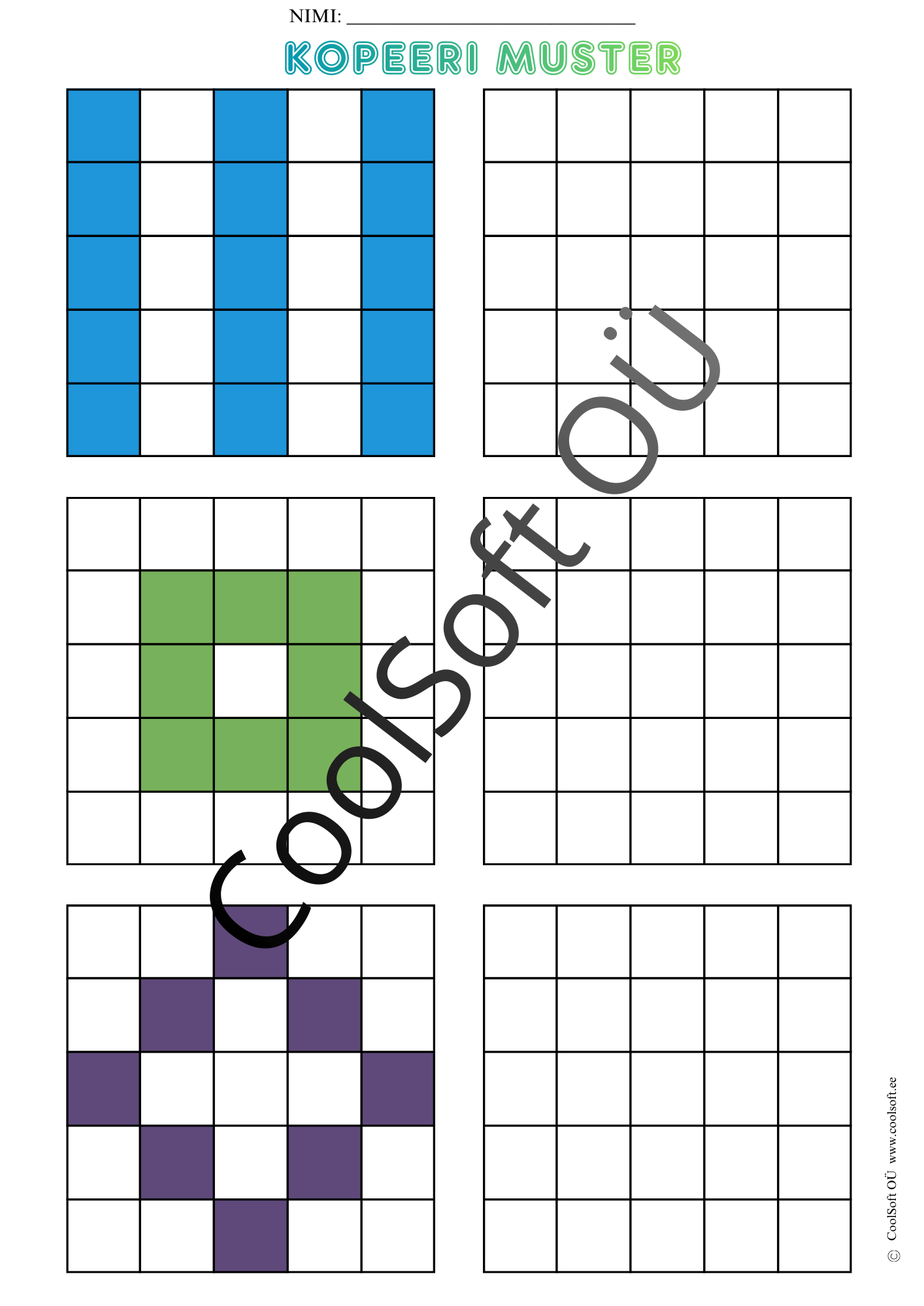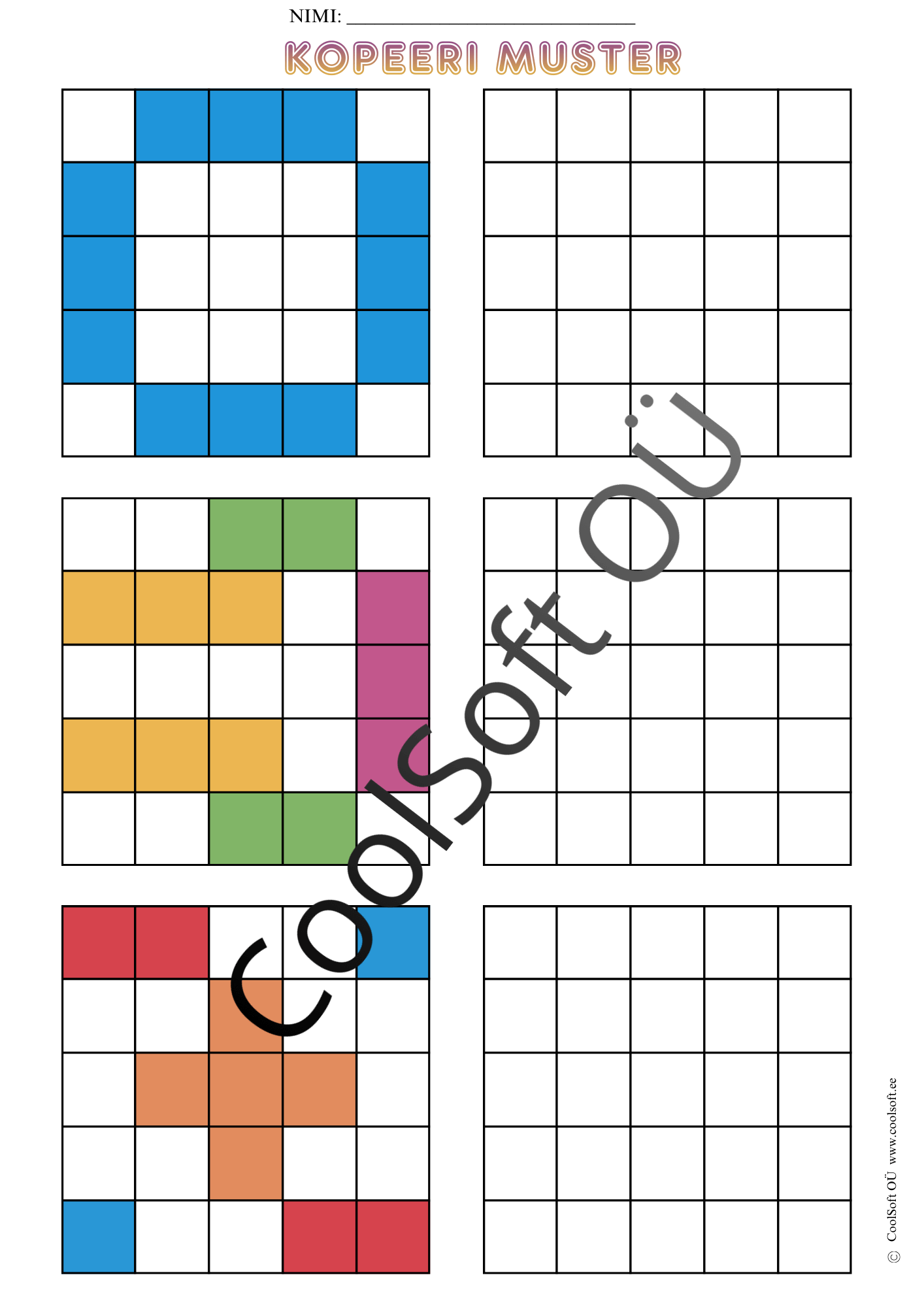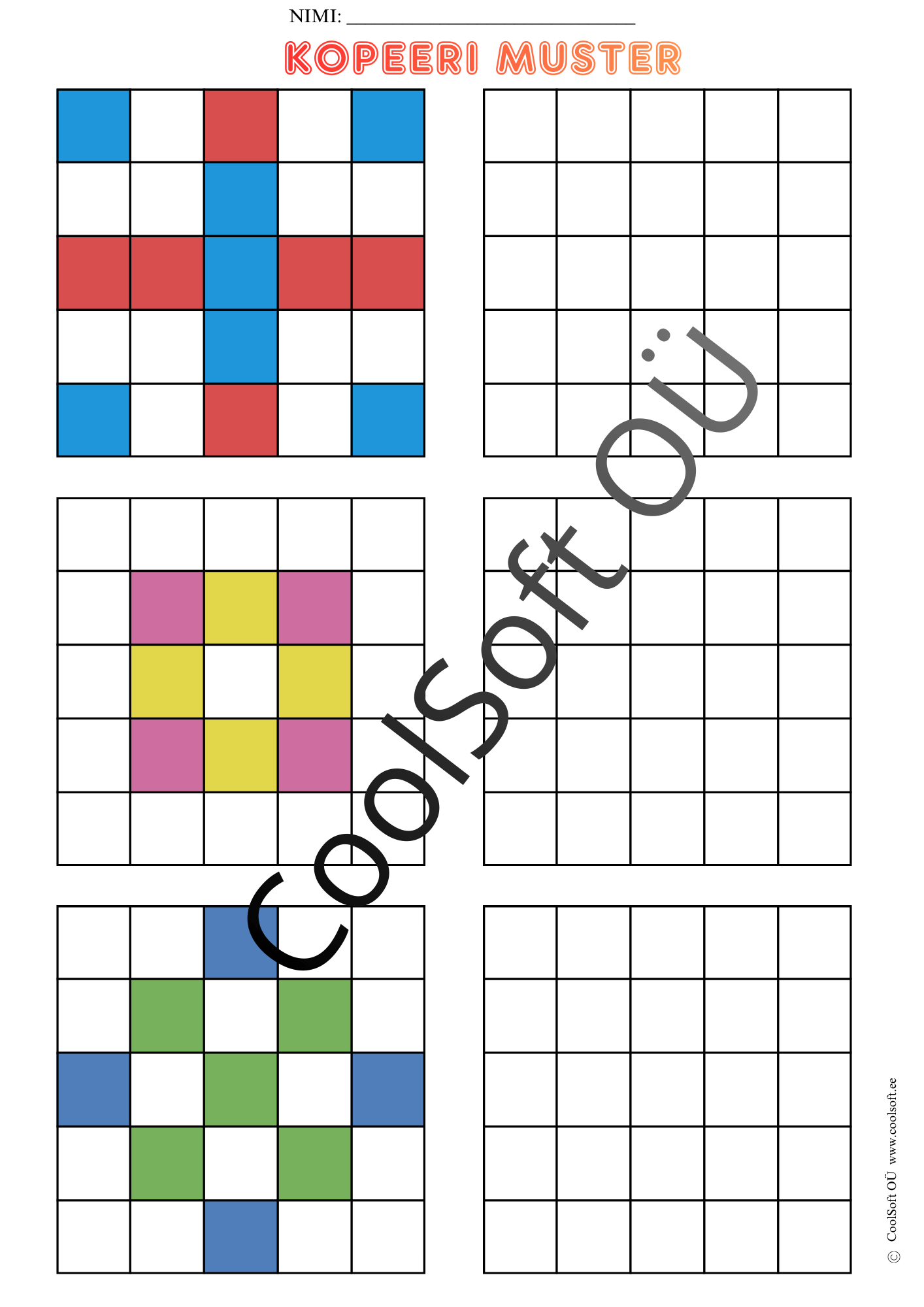 Kopeeri muster on arendav töölehtede komplekt (16 lk), kus laps peab värvilise ruudustikumustri täpselt samasugusena tühjale ruudustikule üle kandma.