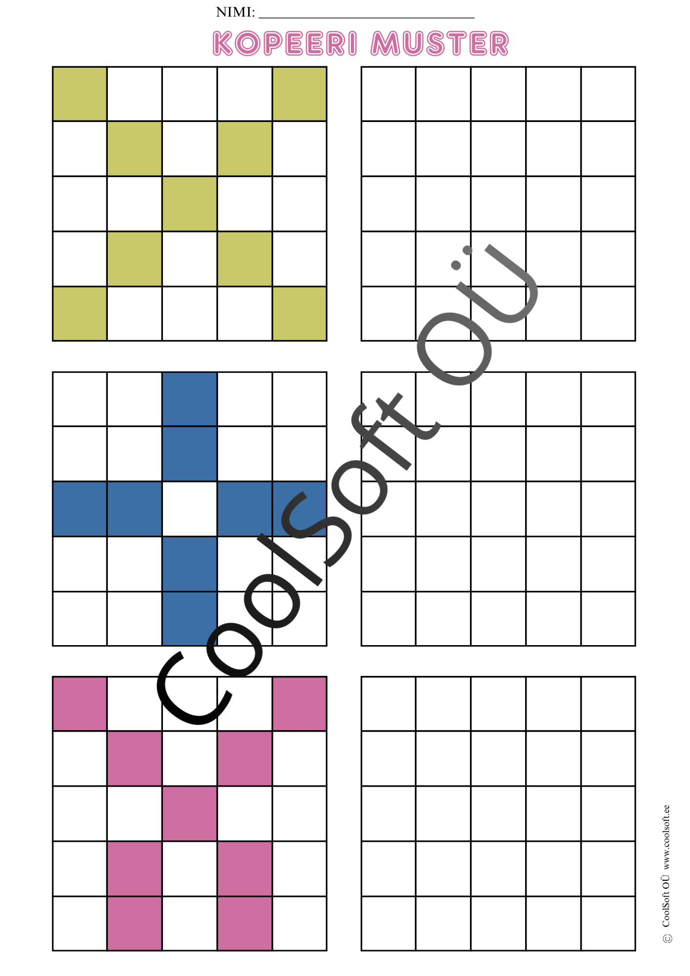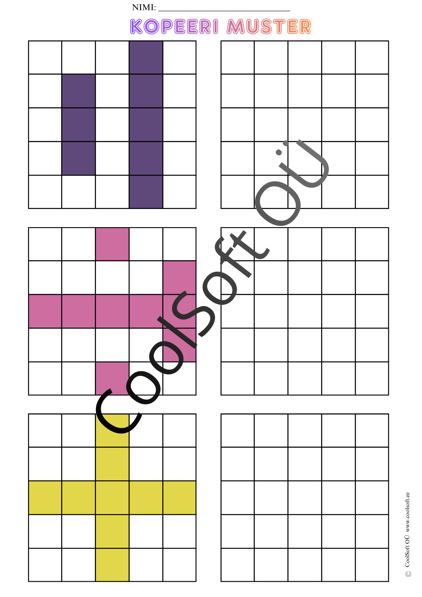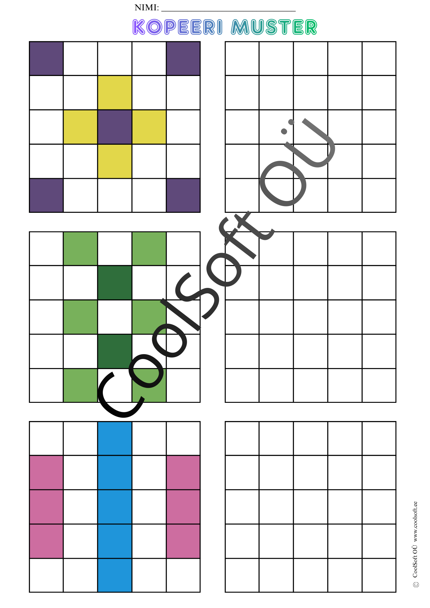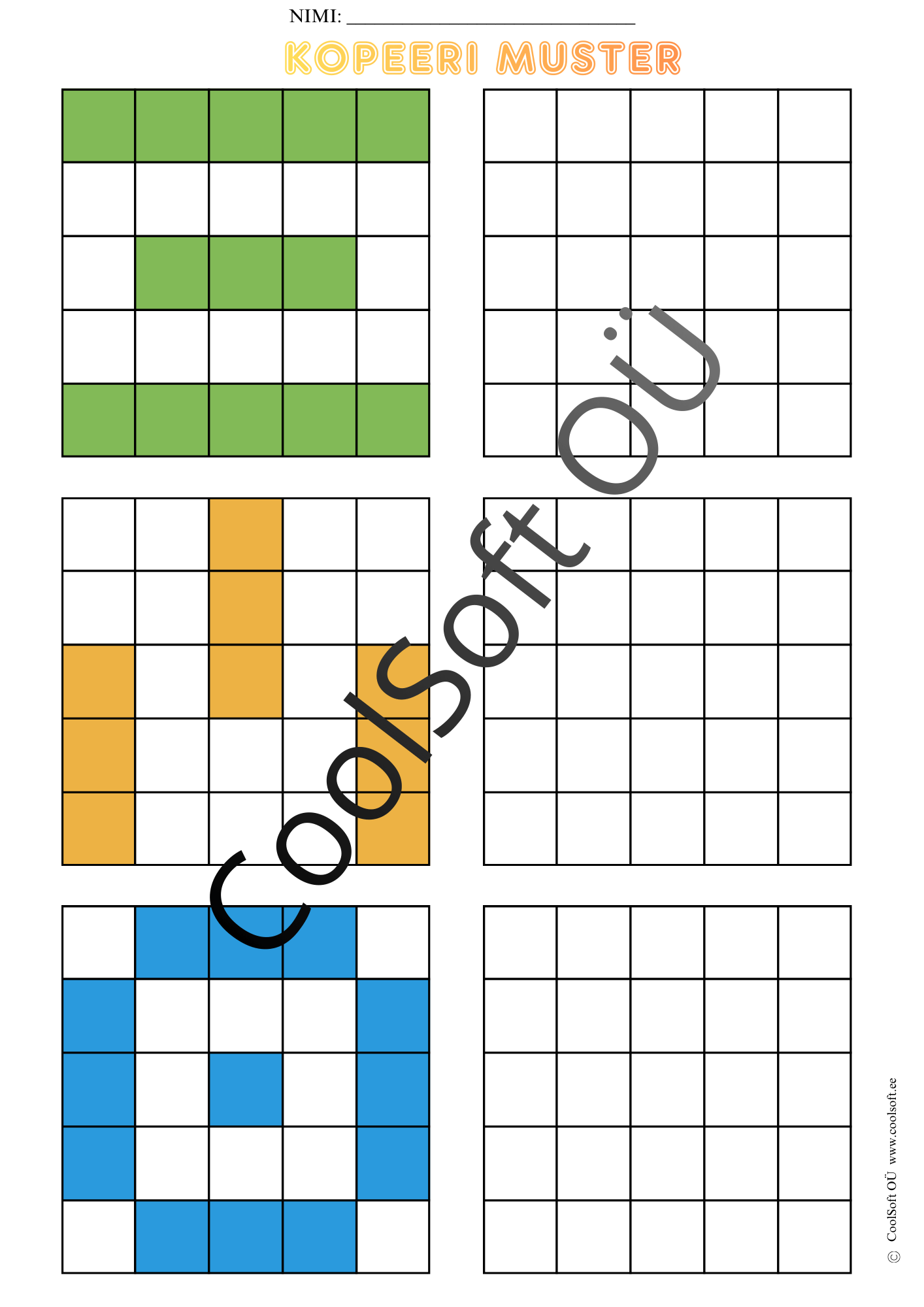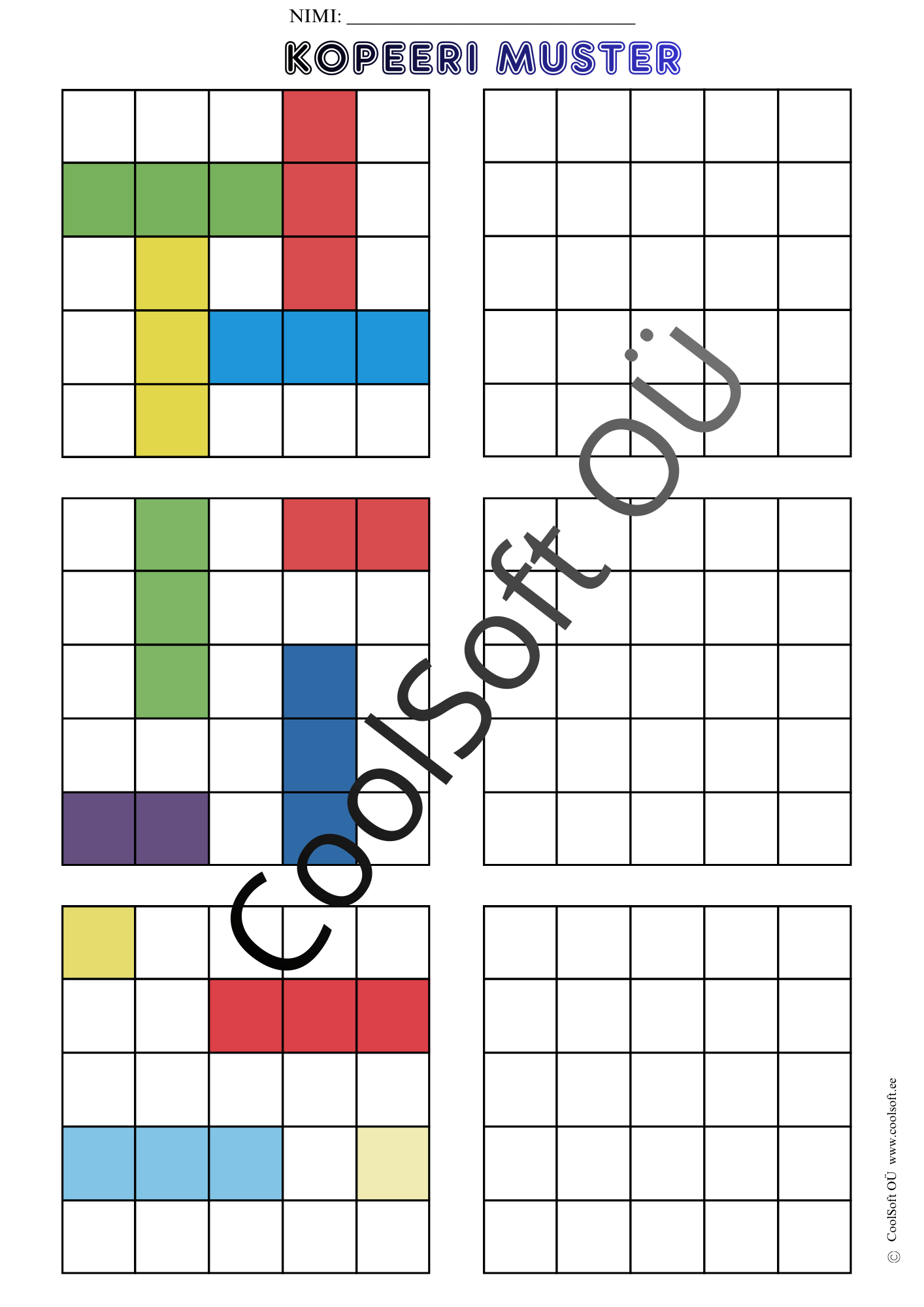 Kopeeri muster on arendav töölehtede komplekt (16 lk), kus laps peab värvilise ruudustikumustri täpselt samasugusena tühjale ruudustikule üle kandma.