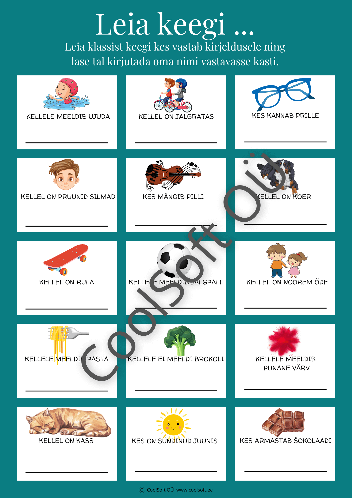 Laps peab klassist leidma kellegi, kes vastab pildil olevale kirjeldusele (nt kellele meeldib ujuda, kellel on kass, kes mängib pilli) ning kirjutama tema nime vastavasse kasti.