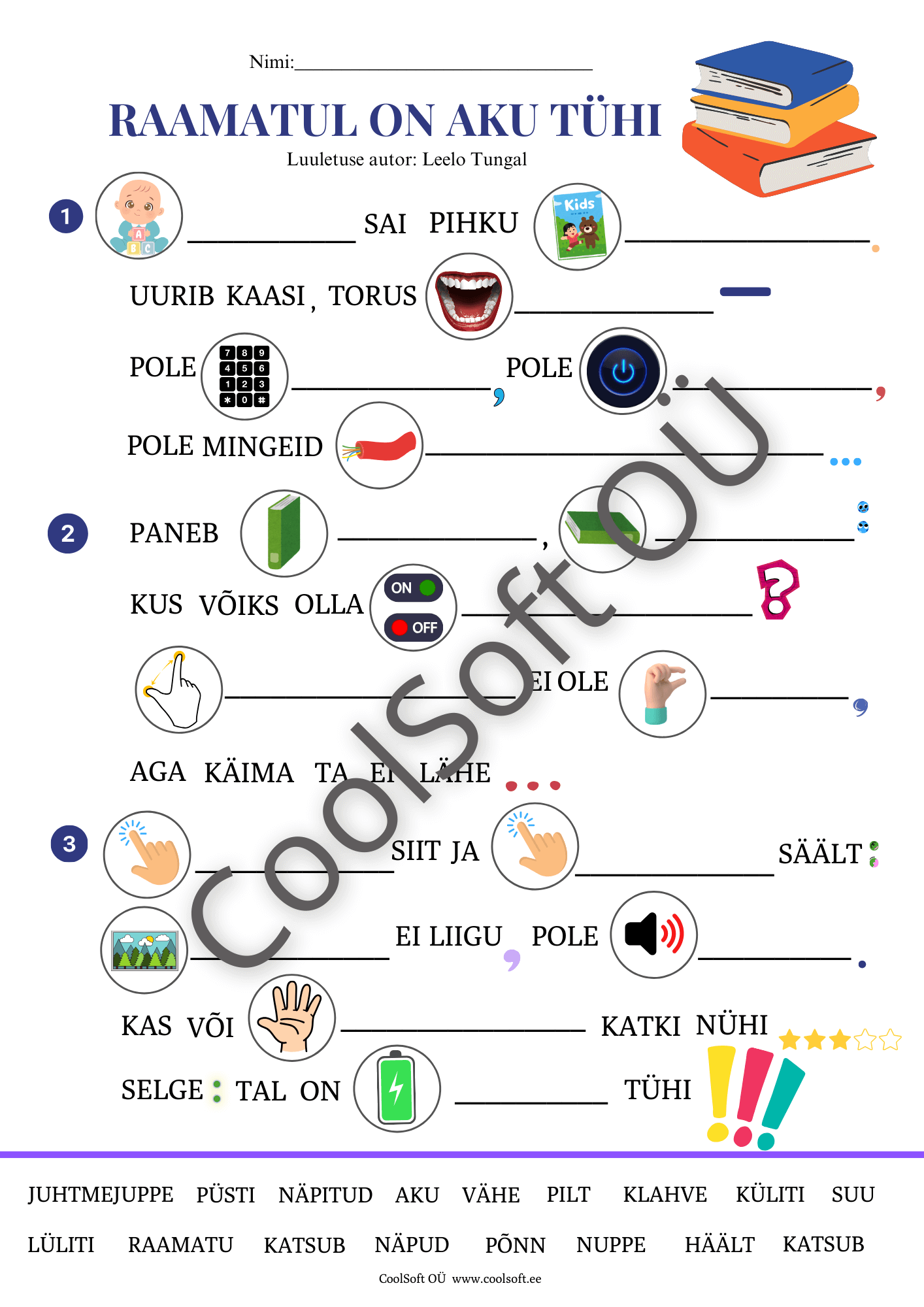 „Raamatul on aku tühi“ on nutikas ja humoorikas eesti keele tööleht, mis põhineb Leelo Tungla luuletusel.