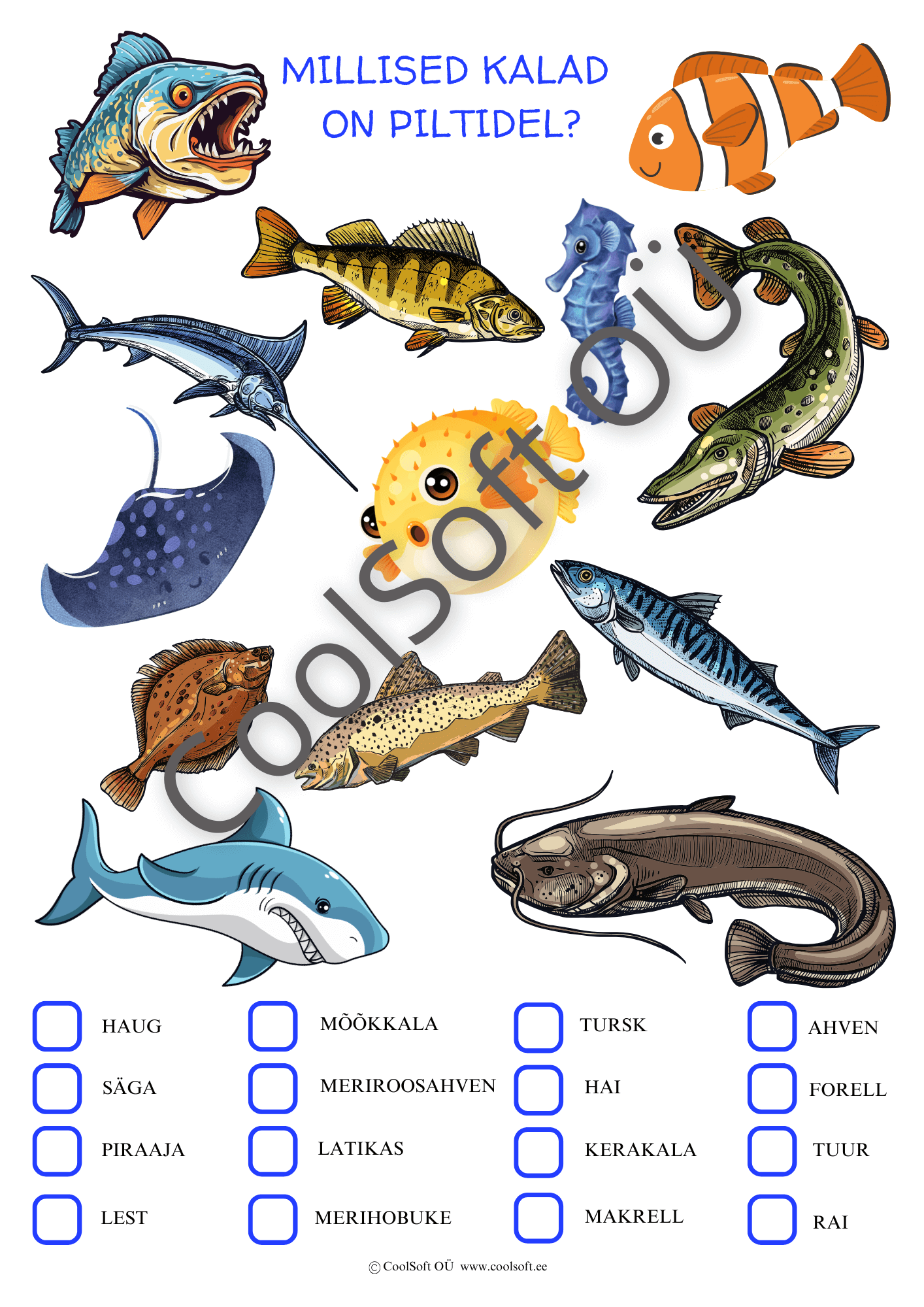 Piltidel on kujutatud erinevad kalad, millede nimetused tuleb üles leida allolevast loetelust. Märgista piltidel kujutatud kala nimetuse kast ristiga.