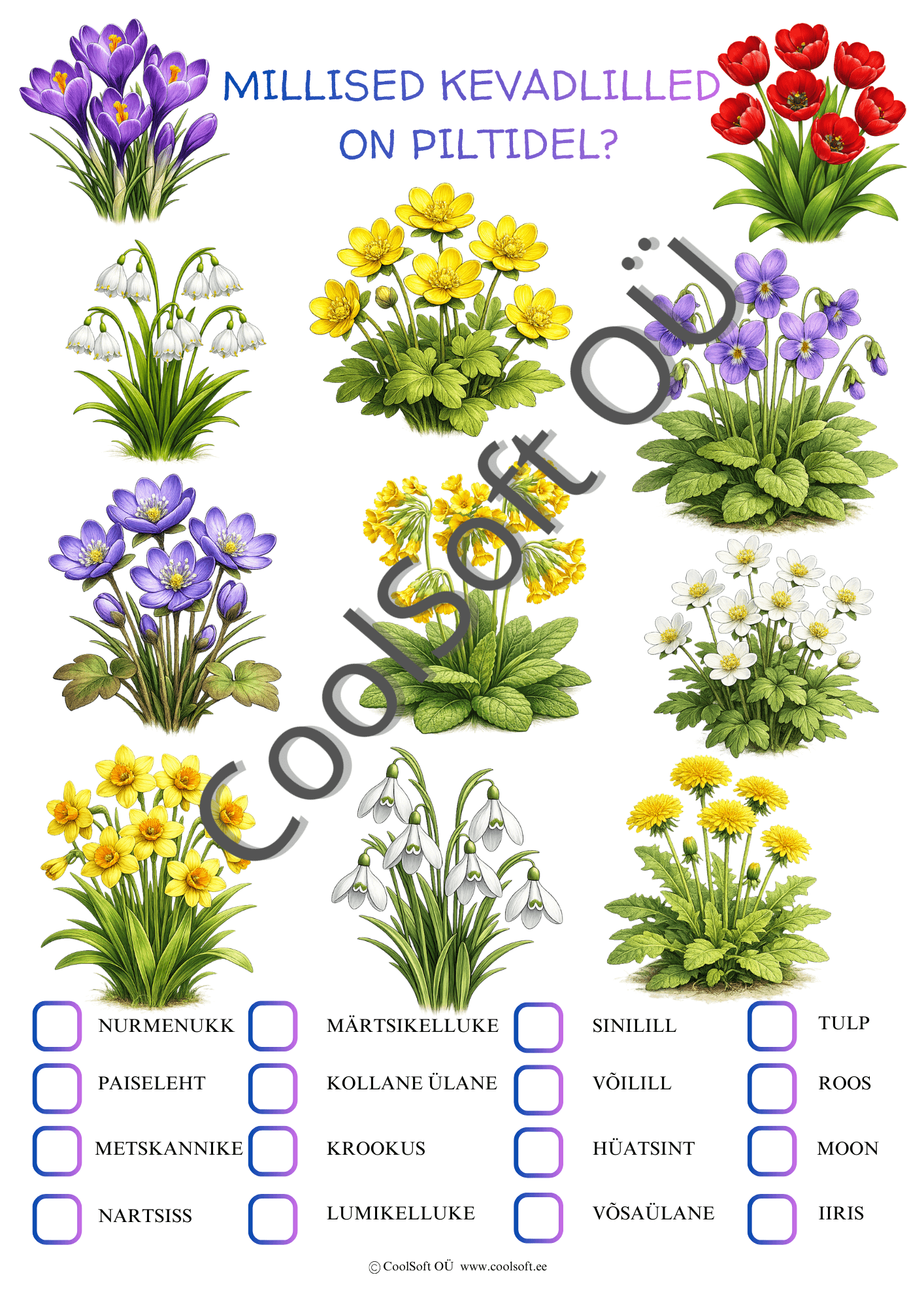 See õpetlik ja visuaalselt kaunis tööleht aitab lastel õppida tundma kevadlilli piltide järgi.🌷🌼 Laps vaatleb pilte, loeb nimetusi ning märgib millised kevadlilled on piltidel kujutatud.