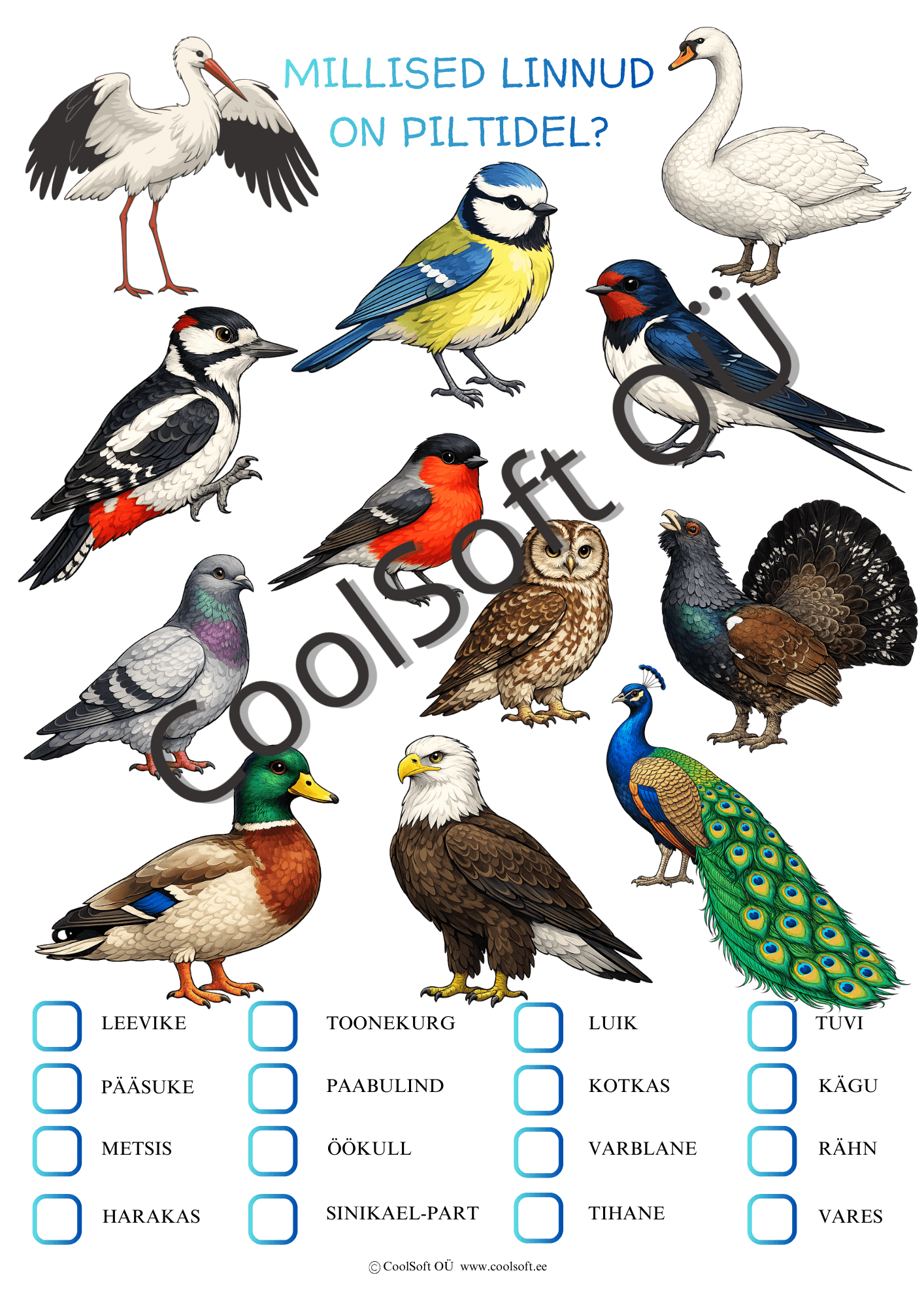 Piltidel on kujutatud järgmised linnud: leevike, pääsuke, metsis, toonekurg, paabulind, öökull, sinikael-part, luik, kotkas, tihane, tuvi ja rähn. 🪶 🌿 🌳