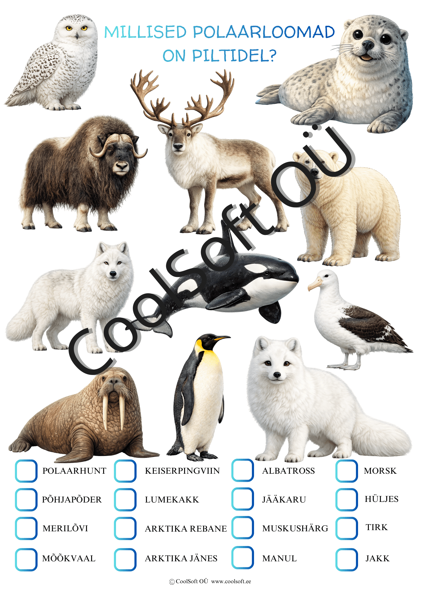 Piltidel on kujutatud järgmised polaarloomad: jääkaru, hüljes, põhjapõder, lumekakk, muskushärg, arktika rebane, polaarhunt, mõõkvaal, keiserpingviin, albatross ja morsk. 🐾