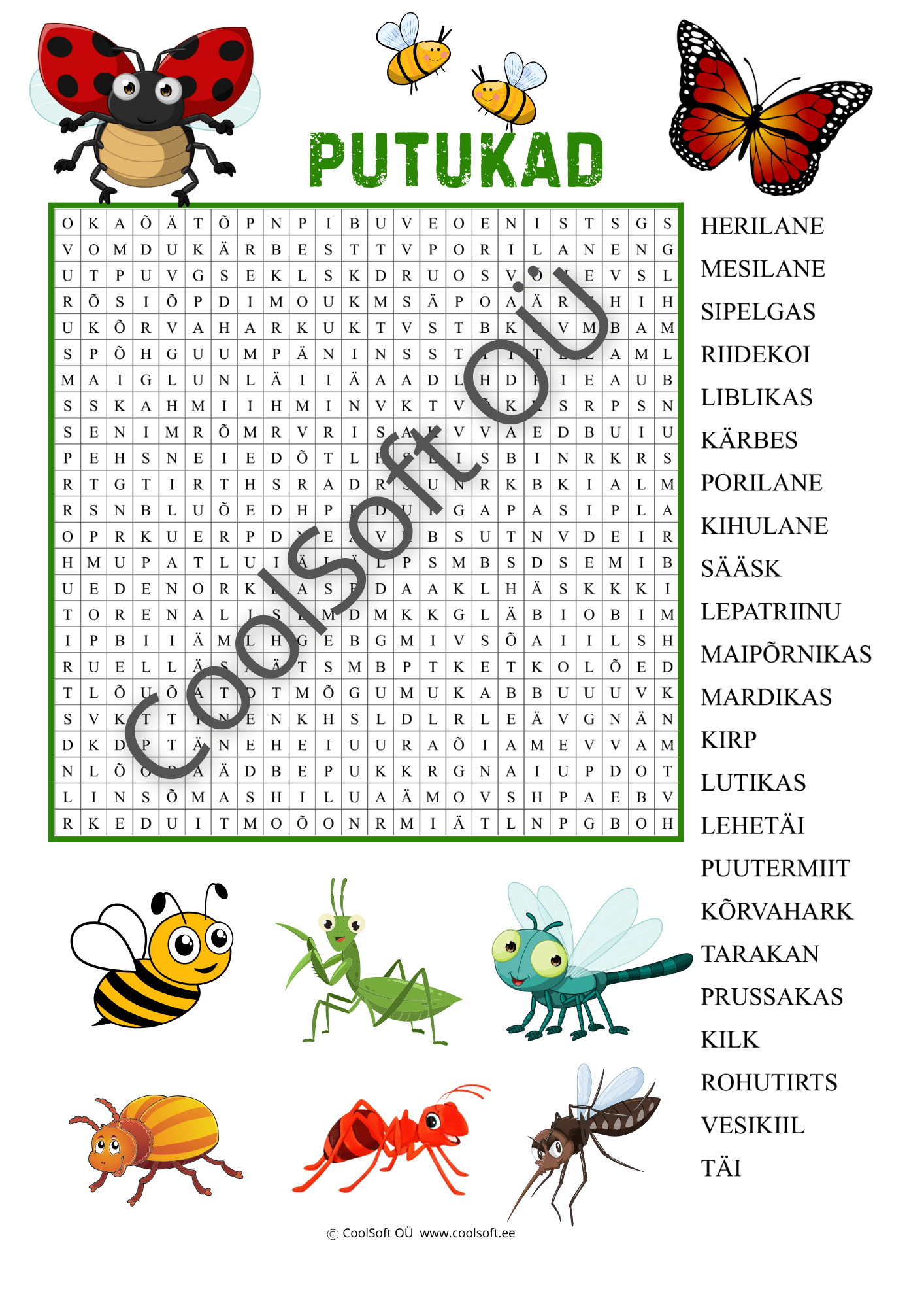 Sõnaotsingust tulevad välja järgmised putukad: herilane, mesilane, sipelgas, riidekoi, liblikas, kärbes, porilane, kihulane, sääsk, lepatriinu, maipõrnikas, mardikas, kirp, lutikas, lehetäi, puutermiit, kõrvahark, tarakan, prussakas, kilk, rohutirts, vesikiil, täi.