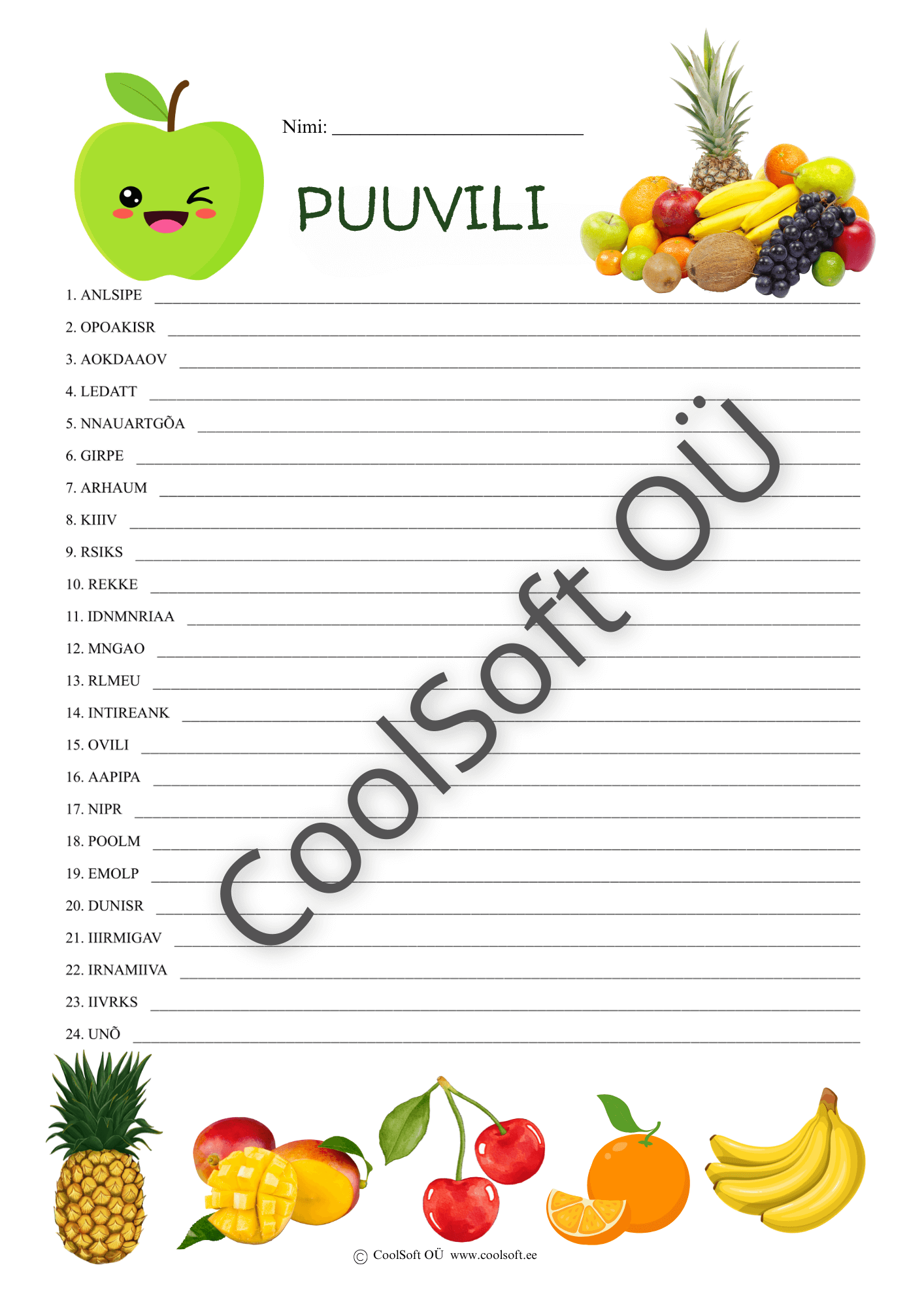 Puuvili on arendav ja mänguline tööleht, kus lapsel tuleb segamini aetud tähed õigesse järjekorda panna ning moodustada erinevate puuviljade nimetused. 🍎🍌🍍