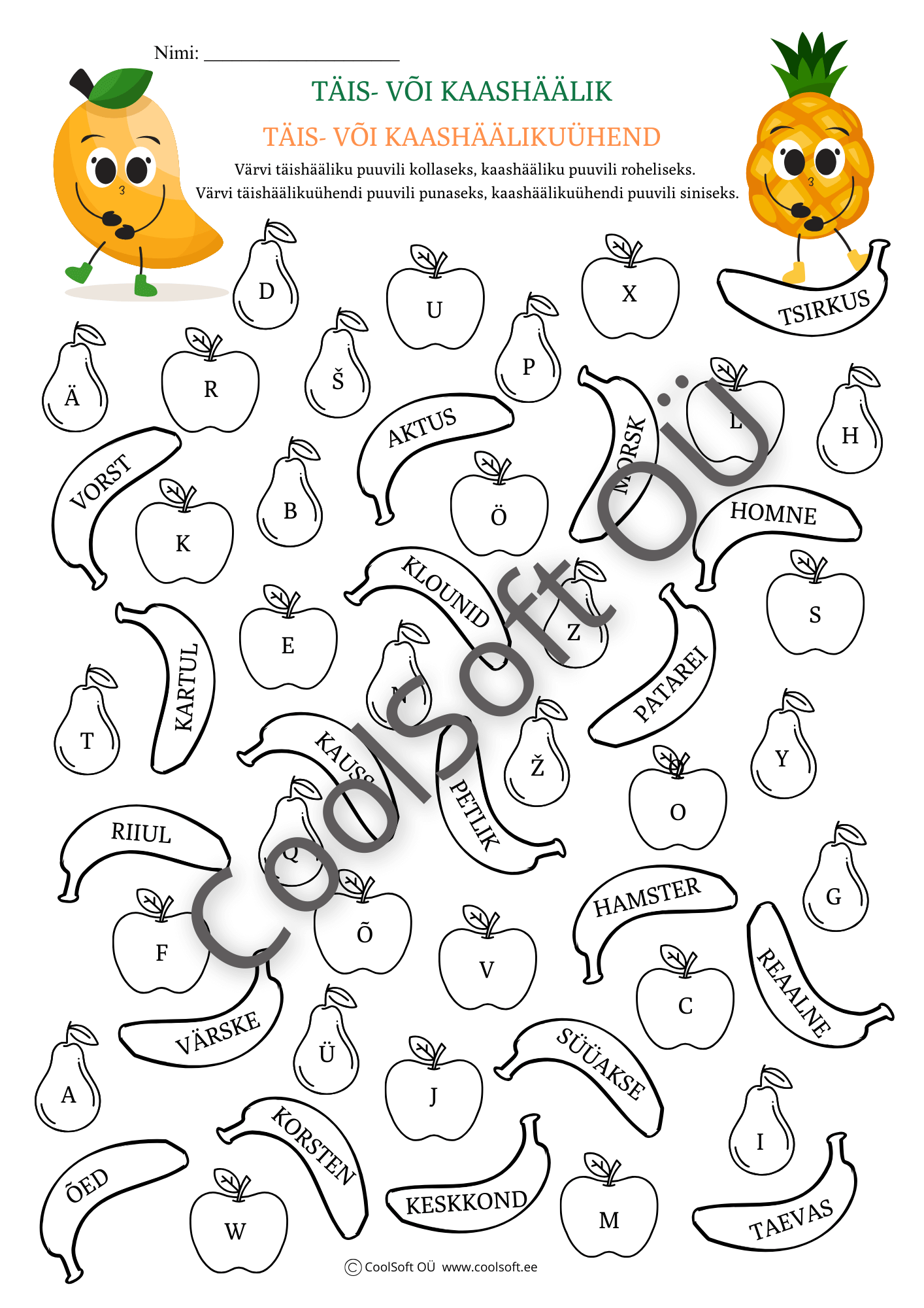 „Täis- või kaashäälik“ on mänguline ja visuaalne eesti keele tööleht, kus lapsed eristavad täishäälikuid ja kaashäälikuid ning täis- ja kaashäälikuühendeid.
