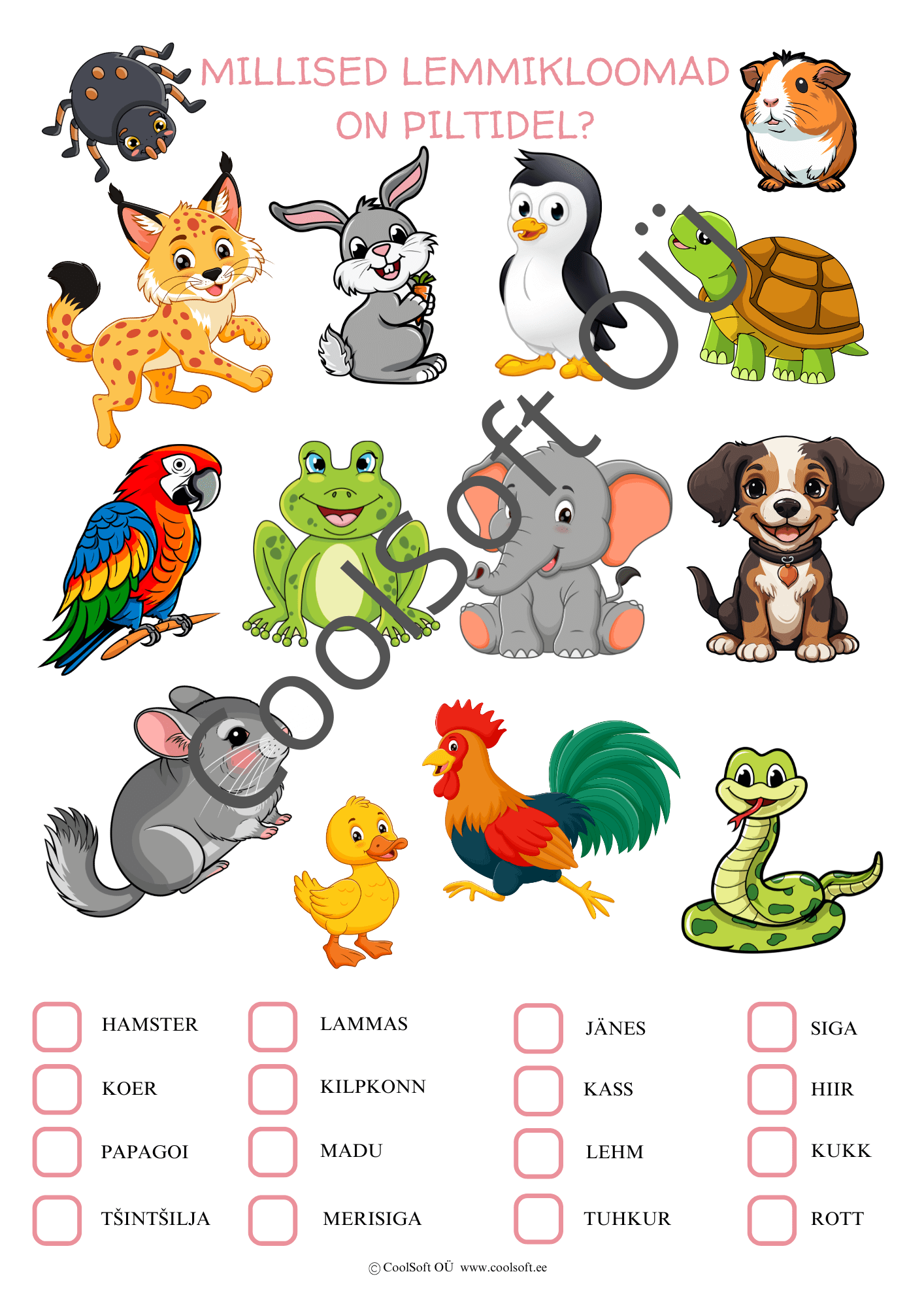 Piltidel on kujutatud erinevad lemmikloomad, millede nimetused tuleb üles leida allolevast loetelust. Märgista piltidel kujutatud lemmiklooma nimetuse kast ristiga.