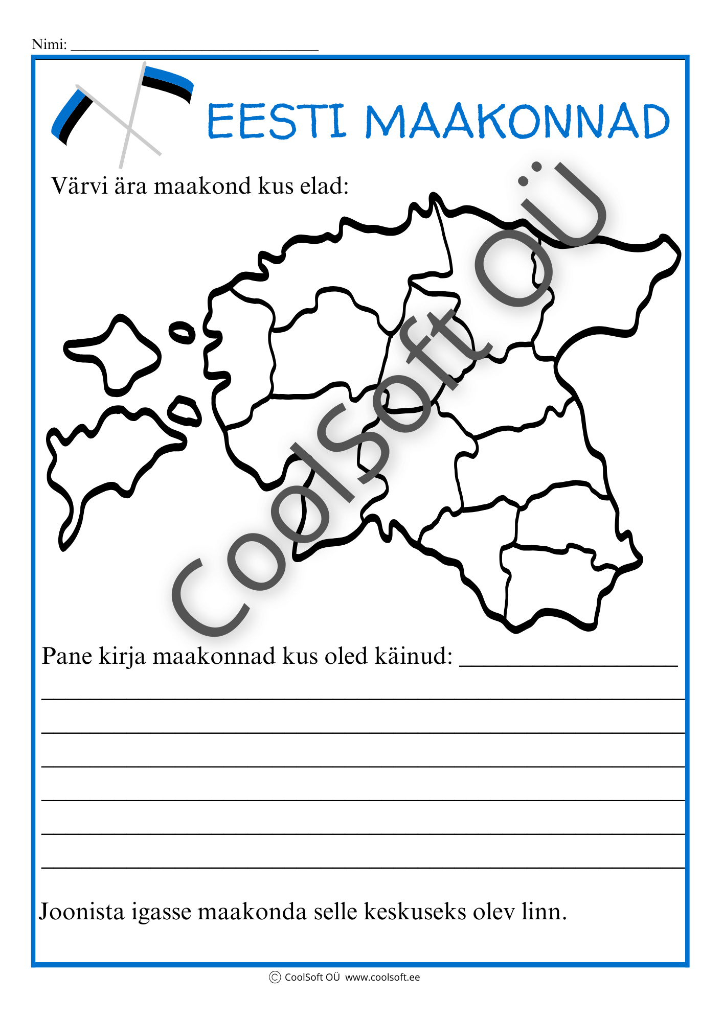 Laps saab värvida maakonna, kus ta elab, kirjutada üles kohad, kus on käinud ning joonistada igasse maakonda selle keskuse linna.