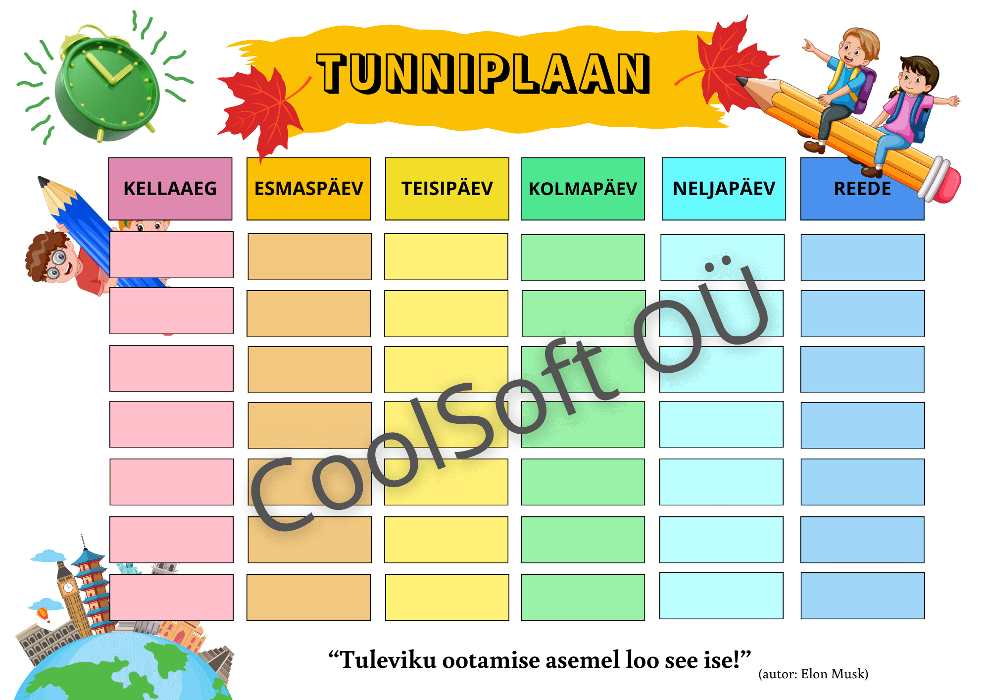 Töölehele saab kirja panna kellaajad ning iga koolipäeva (esmaspäev–reede) tunnid, mis toetab ajaplaneerimise, vastutustunde ja iseseisvuse arengut. ⏰📚