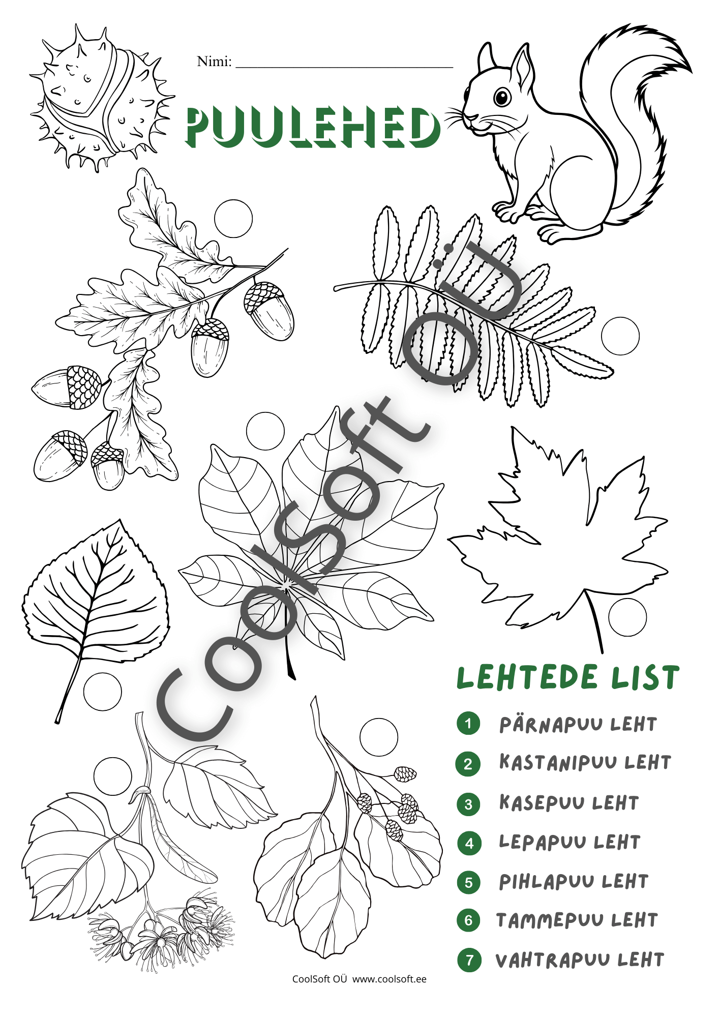 See tööleht aitab lapsel õppida tundma erinevate puude (pärn, kastan, kask, lepp, pihlakas, tamm, vaher) lehti ning märgata nende kuju ja eripärasid. 🍁🌳