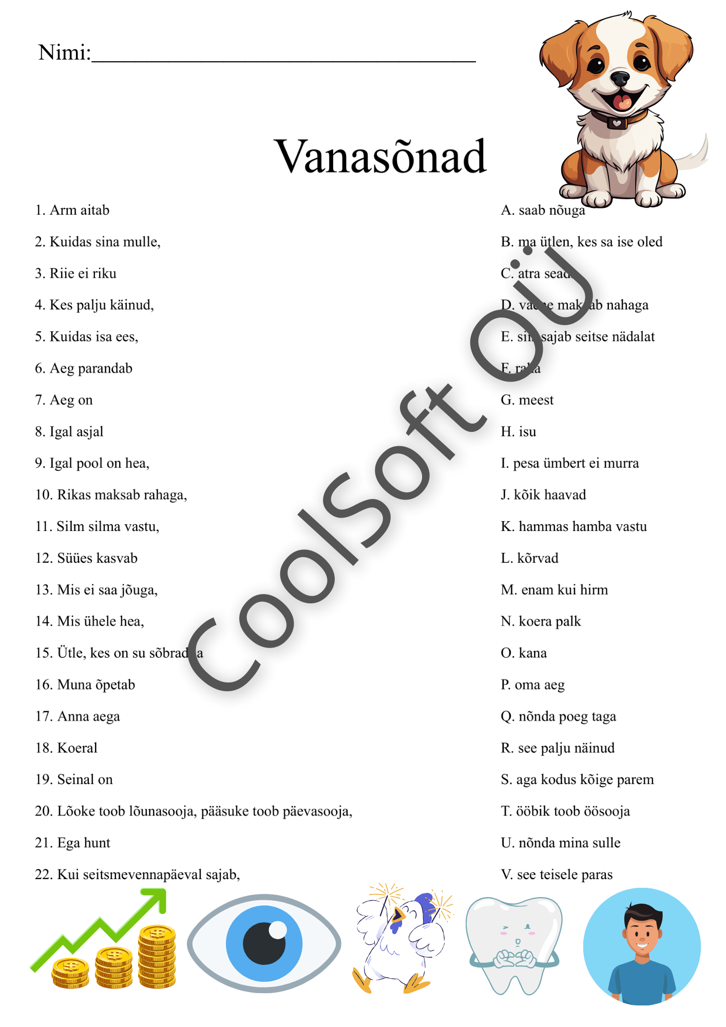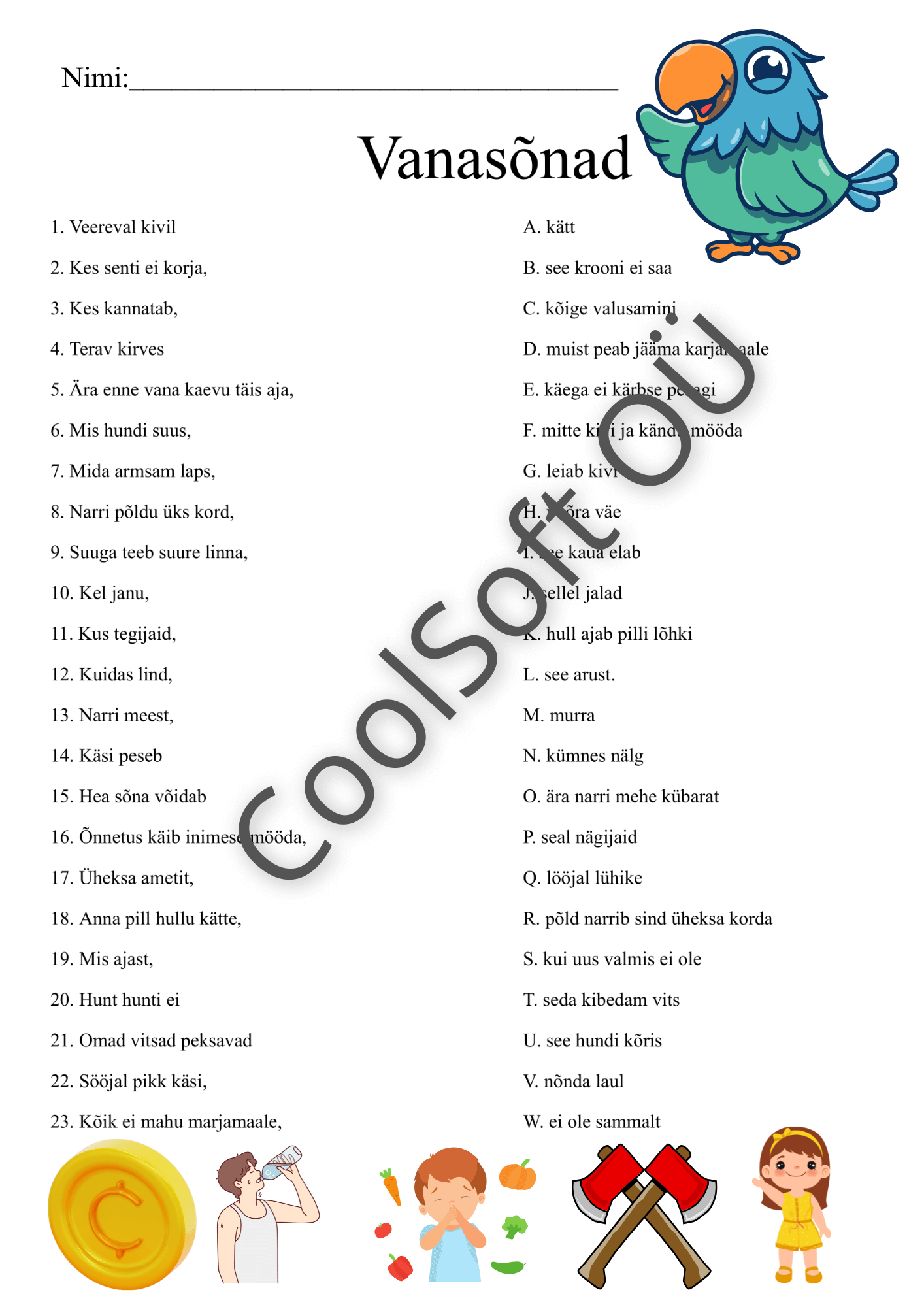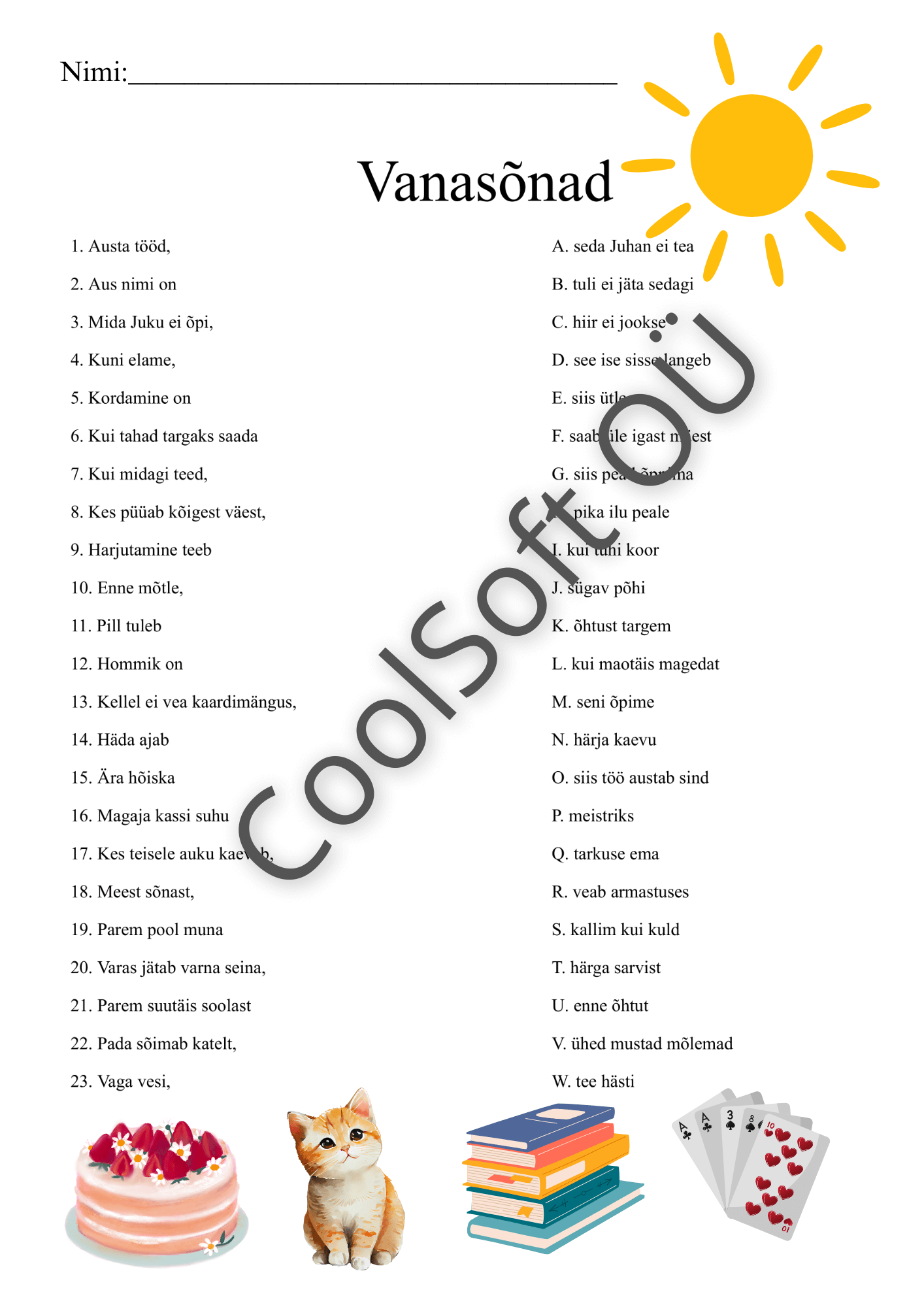 Vanasõnad on sisukas ja arendav sobitamisülesannete kogumik (8 lk), kus õpilane seob vanasõnade algused ja lõpud õigeks tervikuks. 📖☀️🧠