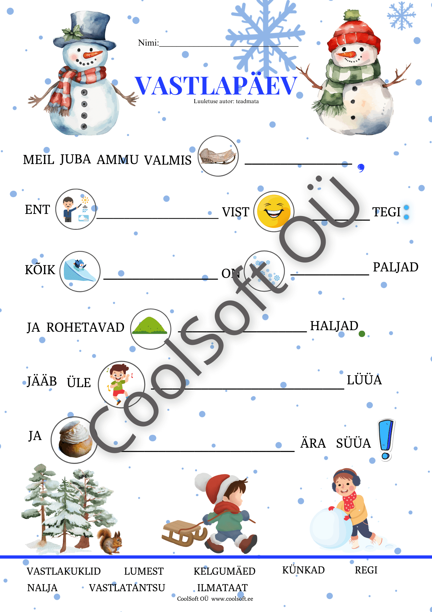 Tööleht sobib hästi lasteaeda ja algklassidesse, vastlapäeva teemalisteks tundideks ning talviste traditsioonide tutvustamiseks. ❄️