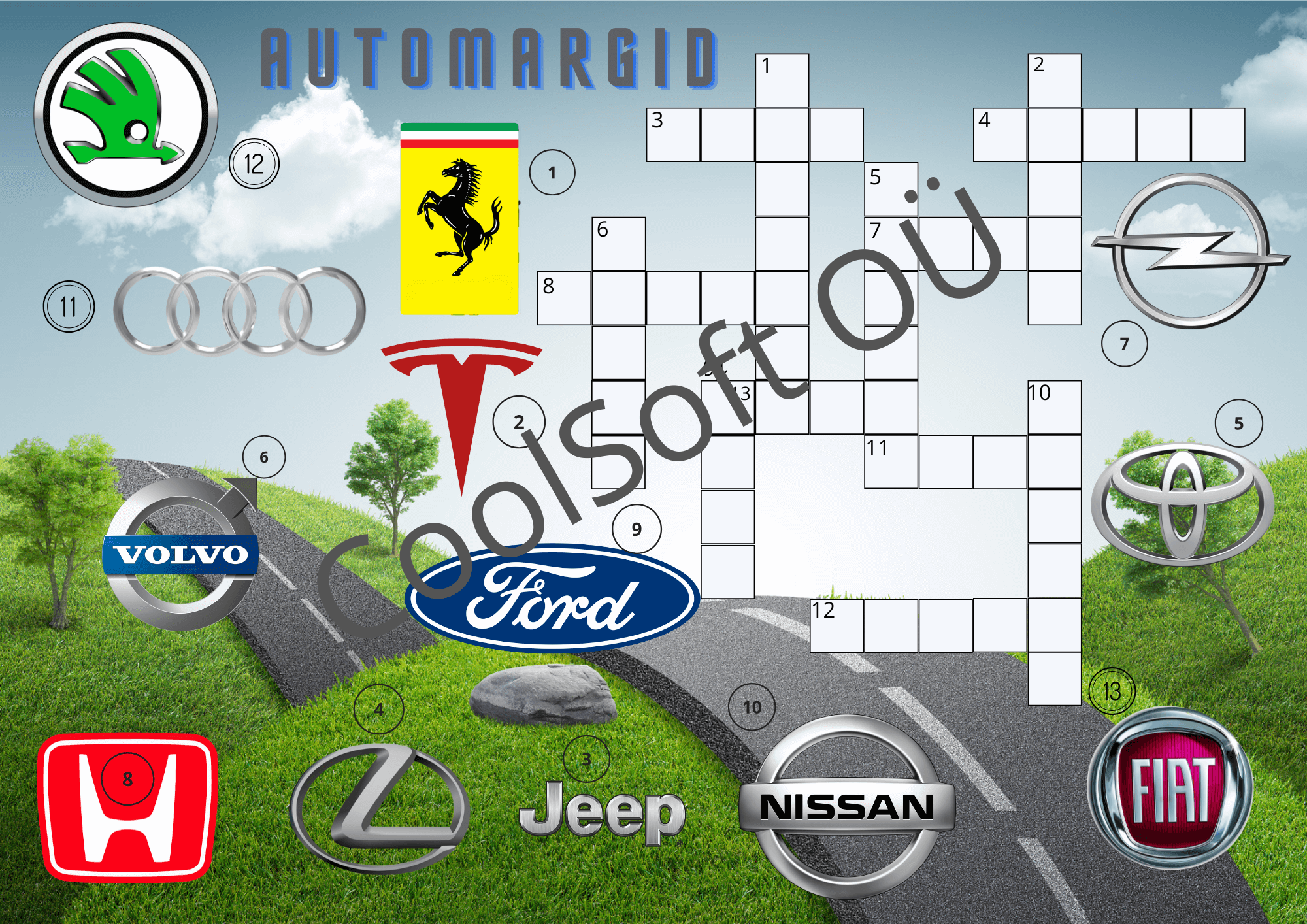 Ristsõna lahendamise kaudu õpib laps tundma järgmisi automarke: Škoda, Ferrari, Tesla, Volvo, Ford, Lexus, Jeep, Honda, Nissan, Fiat, Toyota, Audi ja Opel.