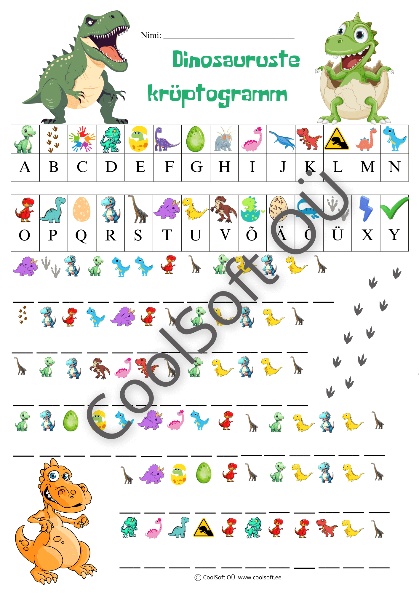 Dinosauruste krüptogrammi tööleht pakub lapsele põnevat mõistatamist, kus dinosauruste piltide abil tuleb lahti murda peidetud sõnad. 🦖🔐