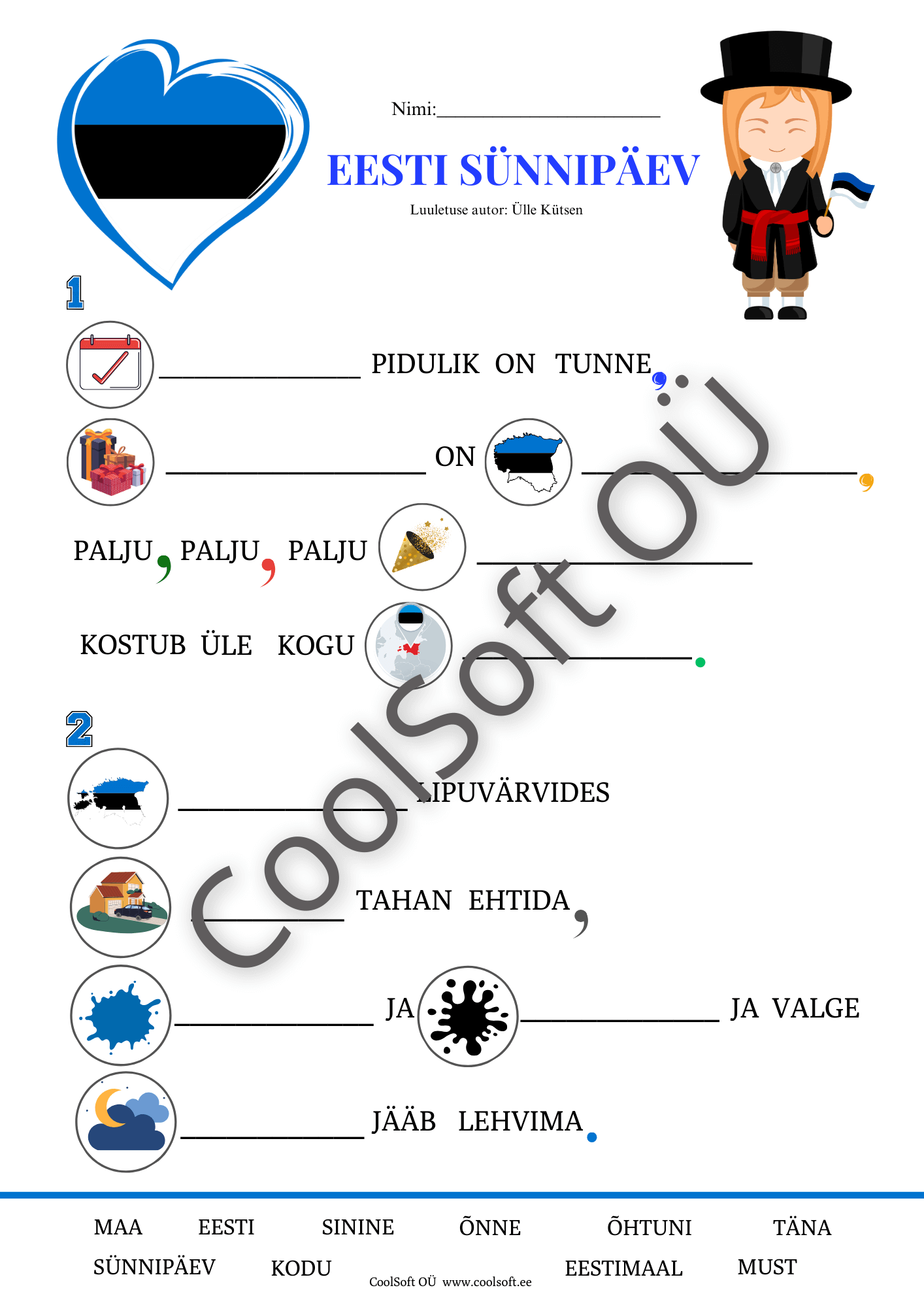 Pildilised vihjed aitavad lapsel sobivaid sõnu valida ning toetavad lugemisoskuse, sõnavara ja teksti mõistmise arengut. Tööleht loob rahuliku ja piduliku meeleolu ning sobib suurepäraselt kasutamiseks 24. veebruari paiku, klassis või kodus 💙🖤🤍