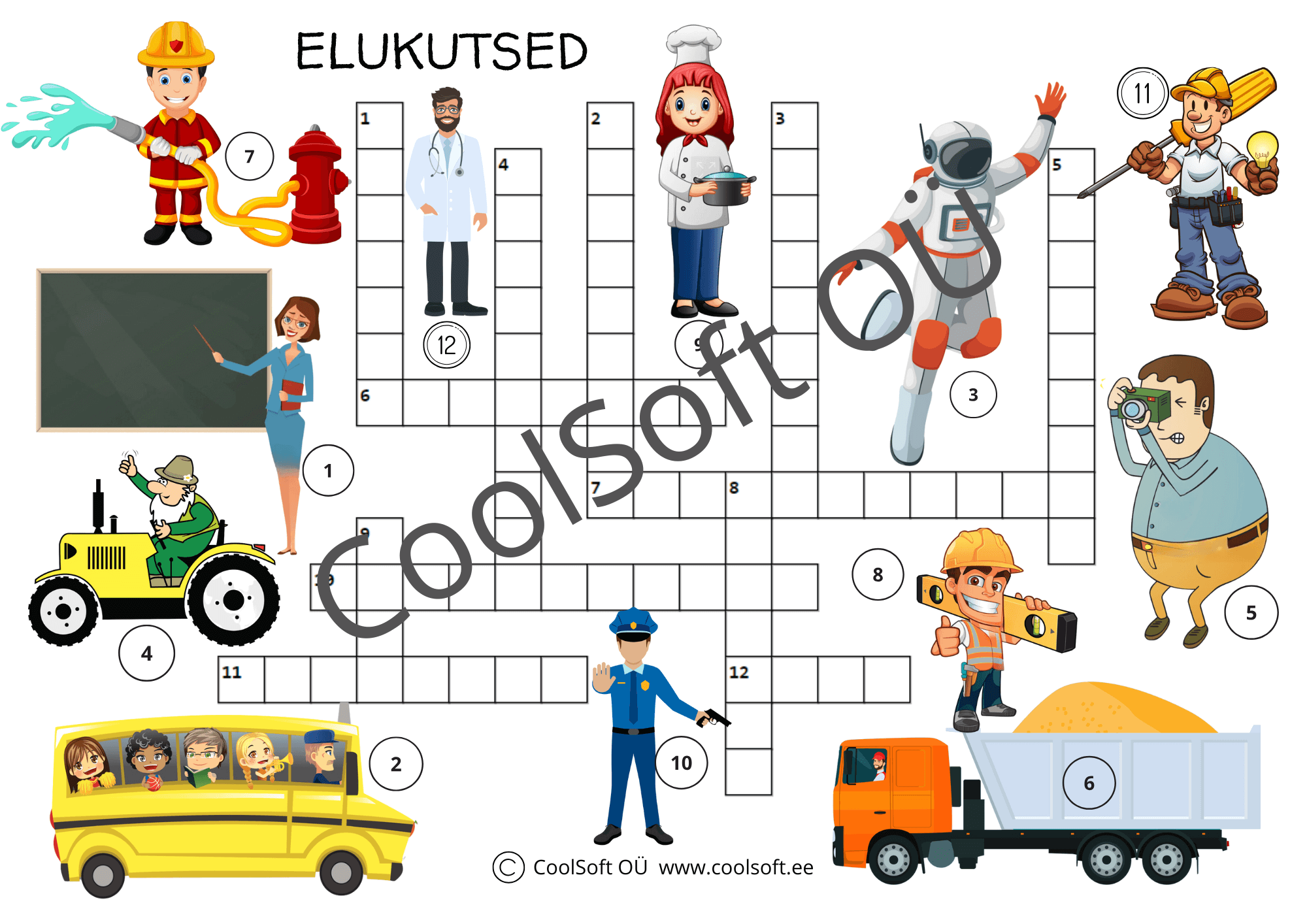 Elukutsed on visuaalselt kaasahaarav ristsõna-tüüpi tööleht, kus laps tutvub erinevate ametitega ning seovad piltidel kujutatud elukutsed õigete nimetustega. 👩🚒👨⚕️🧩