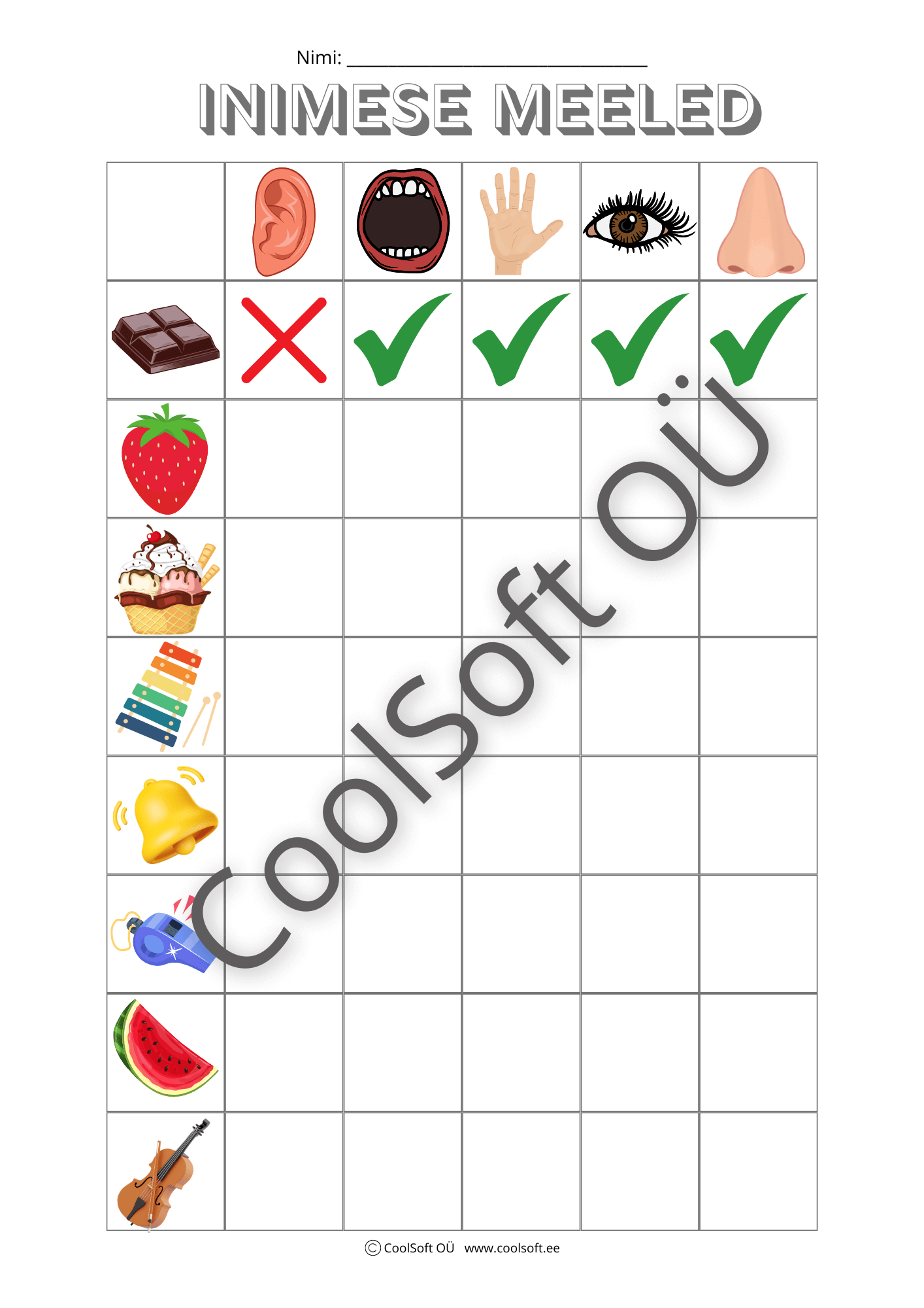 Kas töölehe vasakul pool piltidel kujutatud esemeid on inimesel võimalik näha, maitsta, haista, kompida või kuulda? Tee kastidesse sellekohased märgid. Jaatava vastuse korral tee kasti roheline “linnuke” ning eitava vastuse korral punane rist. Näidisena on tehtud šokolaad.