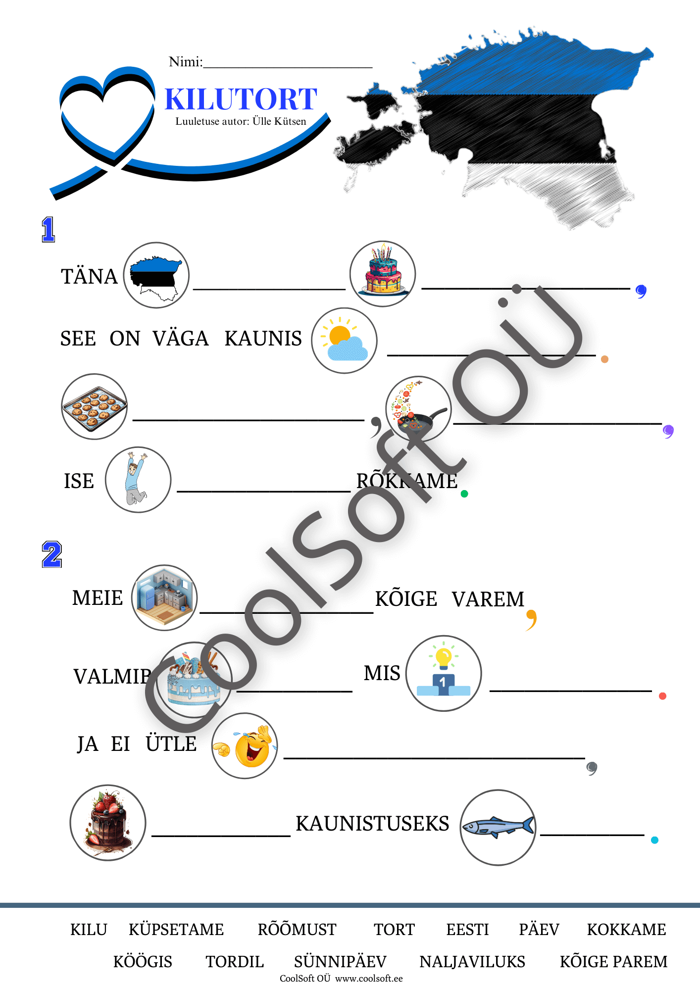 See tööleht põhineb Ülle Kütsen’i luuletusel Kilutort 🎂 ning aitab lapsel arendada lugemisoskust, sõnavara ja teksti mõistmist. 🇪🇪 💙🖤🤍