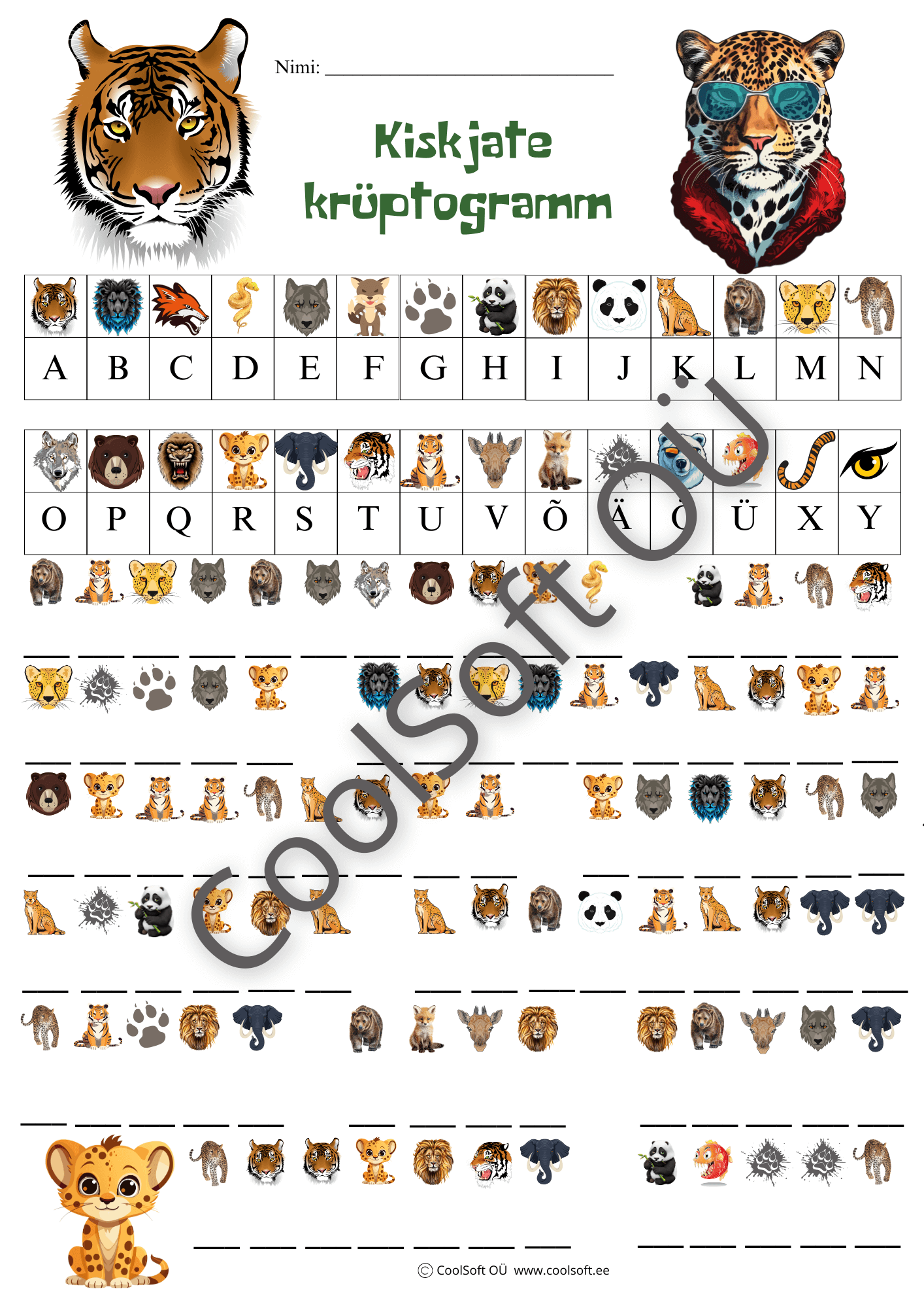 Kiskjate krüptogramm on põnev ja arendav tööleht, kus lapsed lahendavad pildikrüptogramme ning moodustavad loomade piltide abil sõnu ja lauseid. 🐾