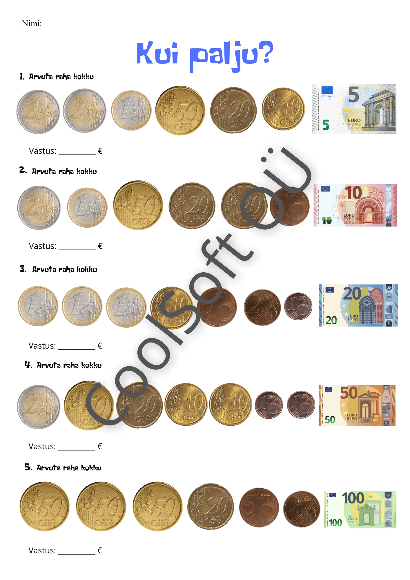Kui palju? on praktiline ja eluline raha arvutamise tööleht, kus laps liidab kokku eurosente ja eurosid ning leiab kogusumma eurodes. 💶🪙