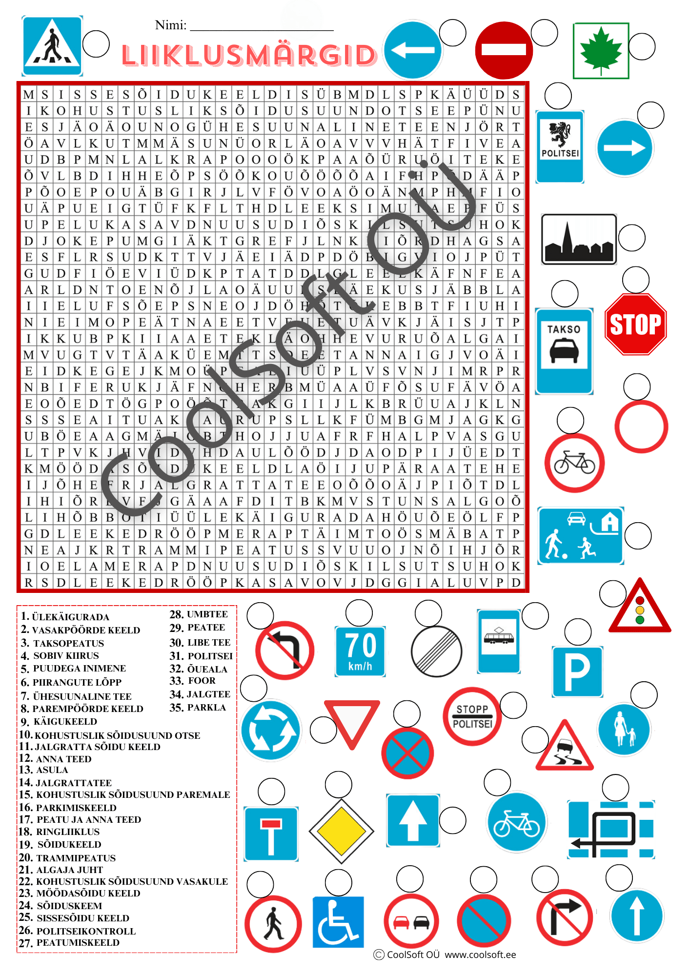 Liiklusmärgid on sisukas sõnaotsimise tööleht, kus laps otsib täheruudust erinevate liiklusmärkide nimetusi ning seob need visuaalsete märkidega. 🚦🛑🚸