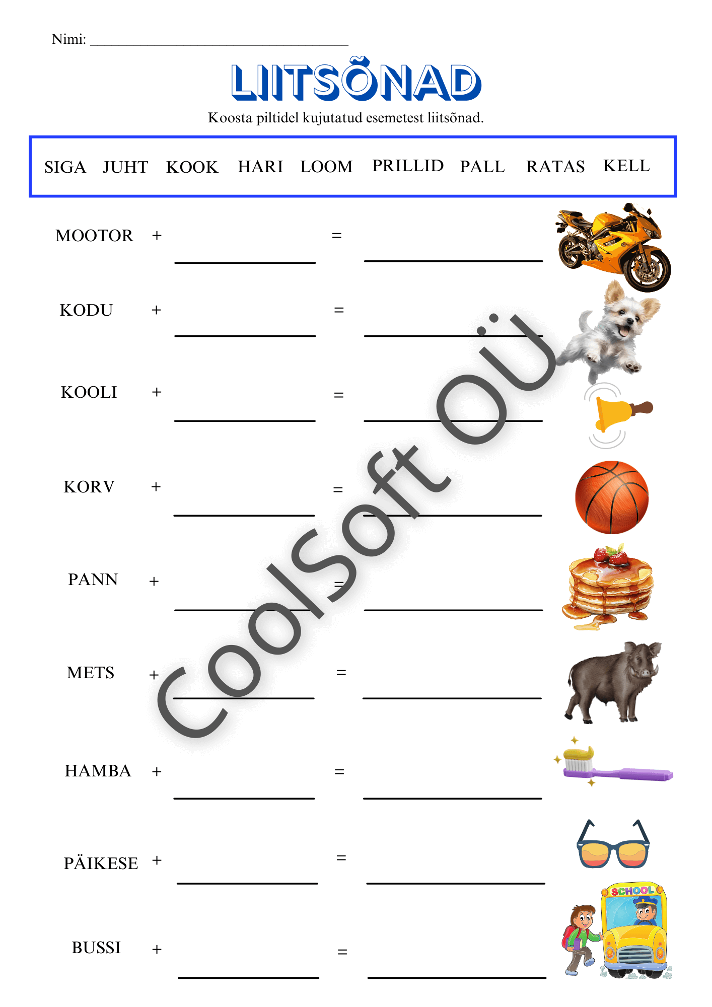 Liitsõnad on arendav ja visuaalselt selge tööleht, kus laps koostab piltidel kujutatud esemetest liitsõnu. ✏️📘