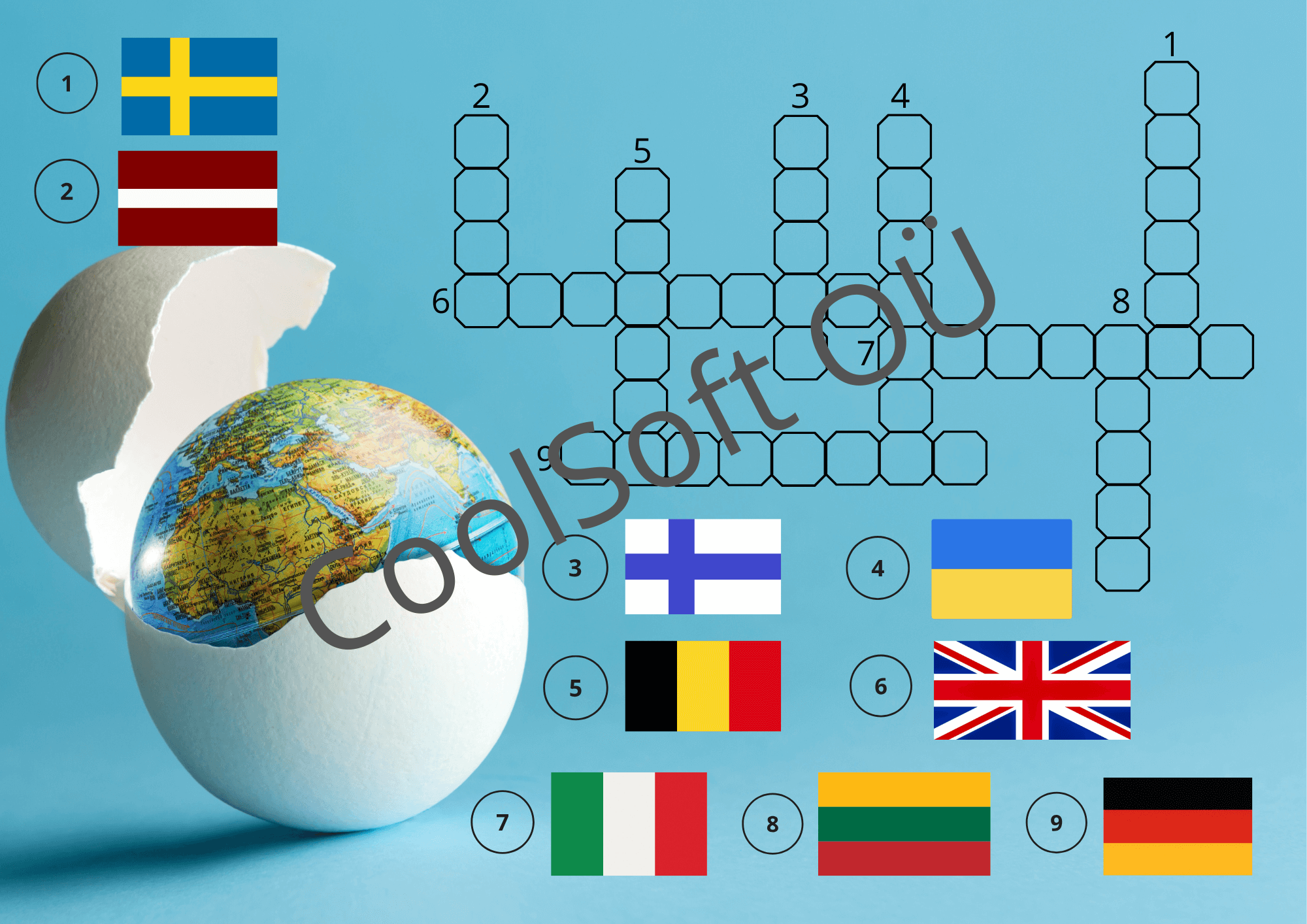 Õpi tundma erinevate riikide lippe. Iga lipu pildi juures on number ja antud lipuga seonduva riigi nimetus tuleb siis kirjutada ruudustiku vastava numbri juurde.