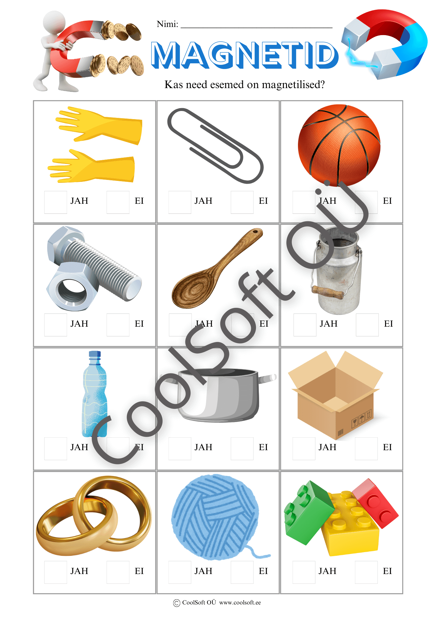 Magnetid on praktiline ja arendav tööleht, kus laps uurib, millised igapäevased esemed on magnetilised ja millised mitte.