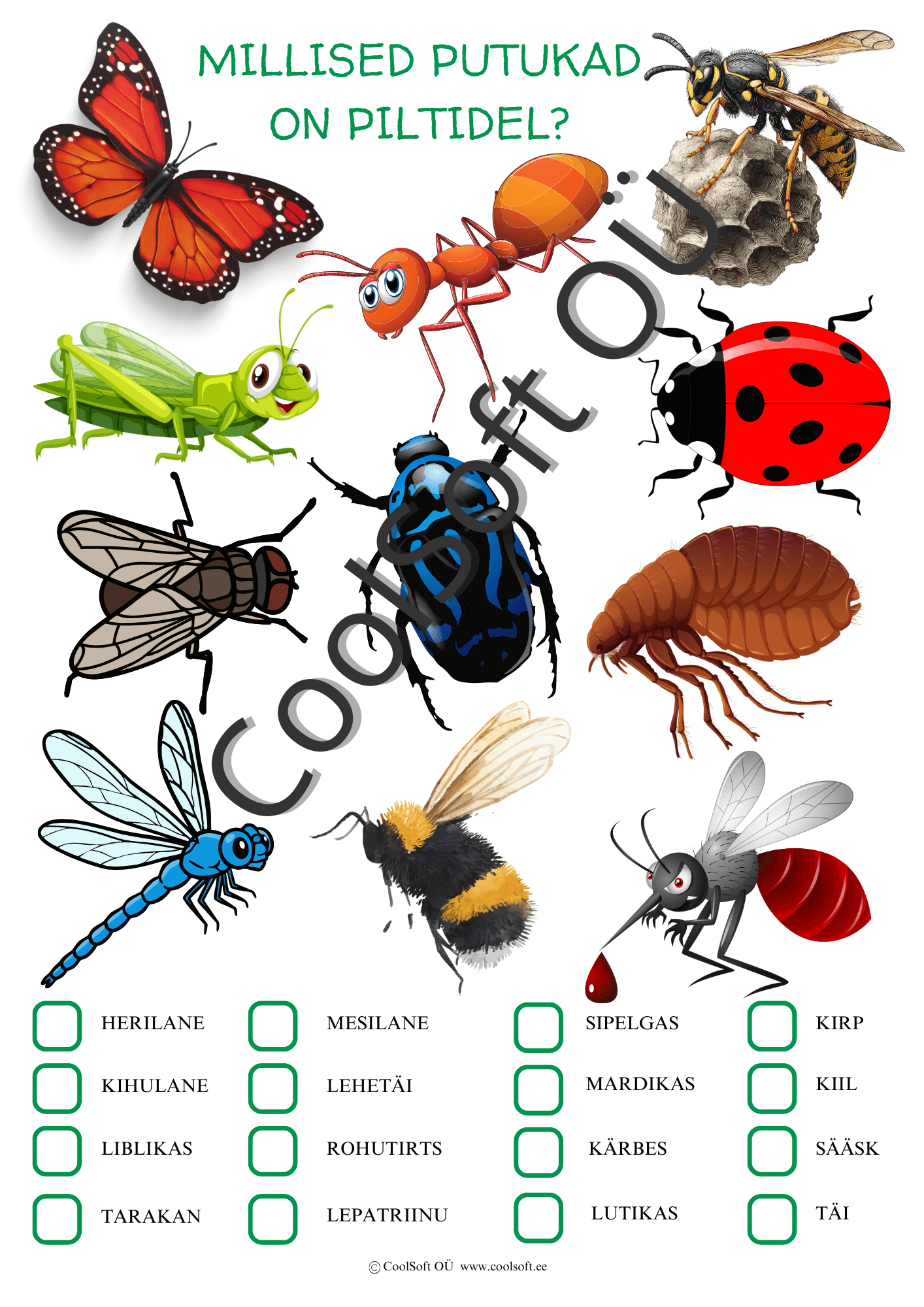 Piltidel on kujutatud järgmised putukad: herilane, liblikas, mesilane, rohutirts, lepatriinu, sipelgas, mardikas, kärbes, kirp, kiil ja sääsk.