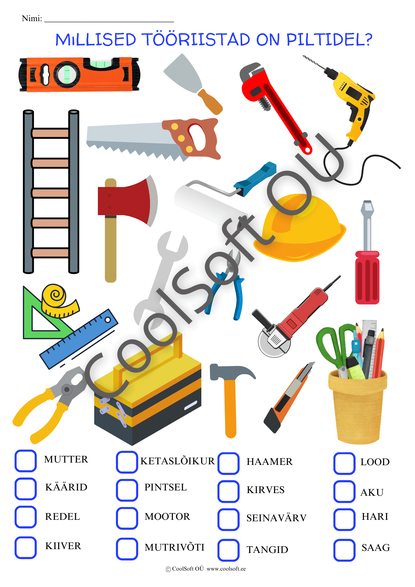 Piltidel on kujutatud erinevad tööriistad, millede nimetused tuleb üles leida allolevast loetelust. Märgista piltidel kujutatud tööriista nimetuse kast ristiga.