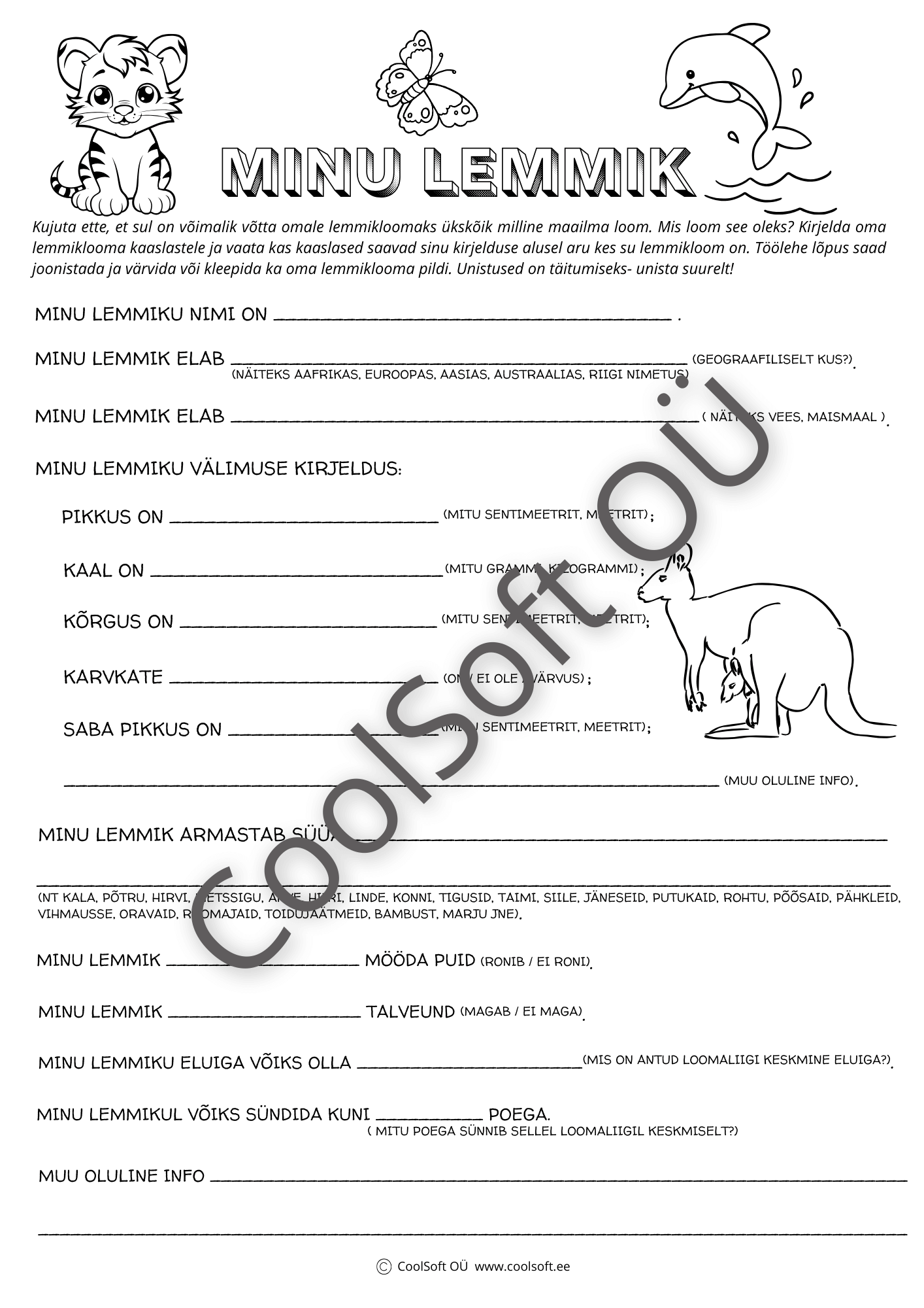 Minu lemmik on loov ja arendav tööleht, kus laps saab välja mõelda ja põhjalikult kaaslastele kirjeldada oma lemmiklooma – olgu see päris loom või hoopis fantaasiast sündinud tegelane ning kaaslased peavad ära arvama mis loomaga on tegemist. Töölehe teisel lehel saab laps joonistada ja värvida või kleepida ka oma lemmiku pildi. 🐯🦘🐬