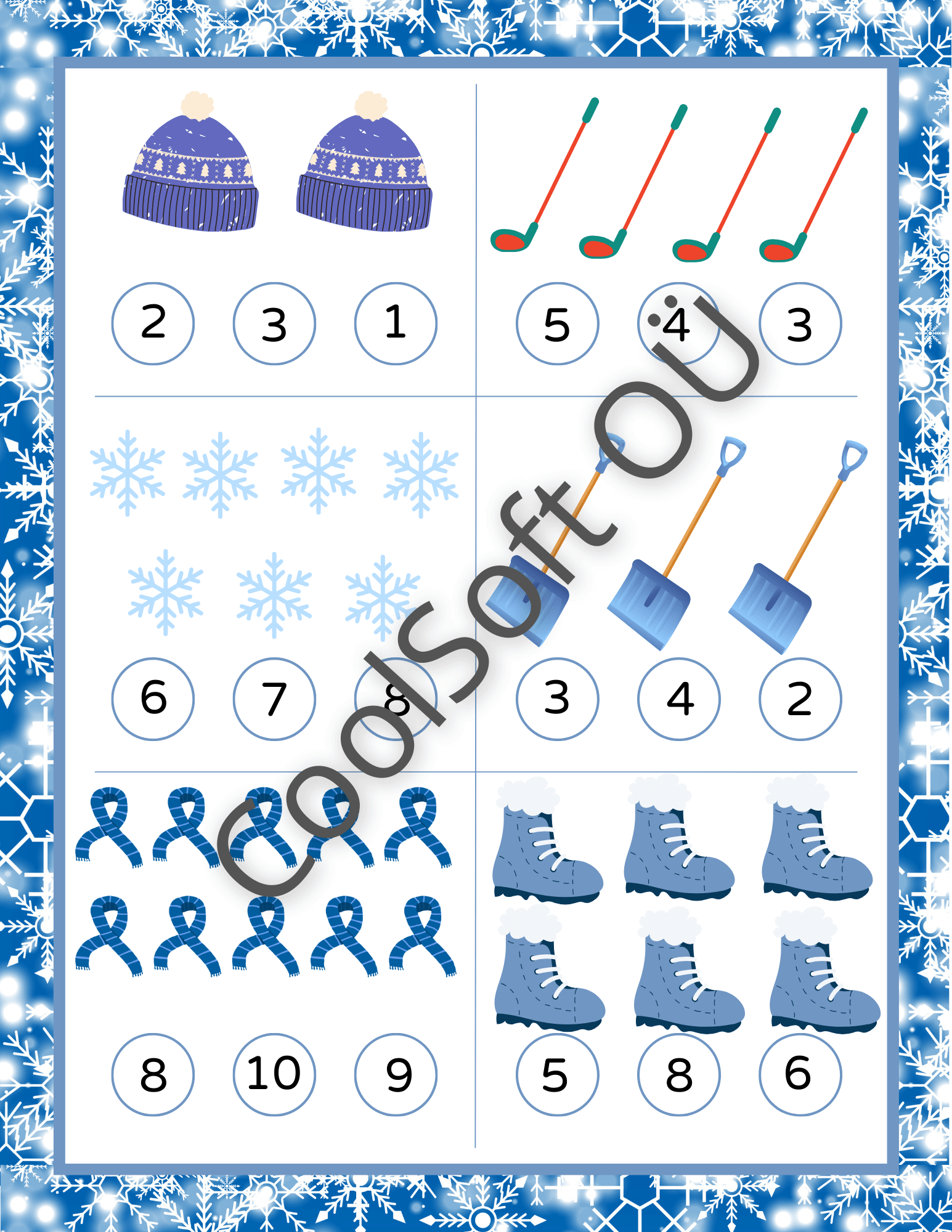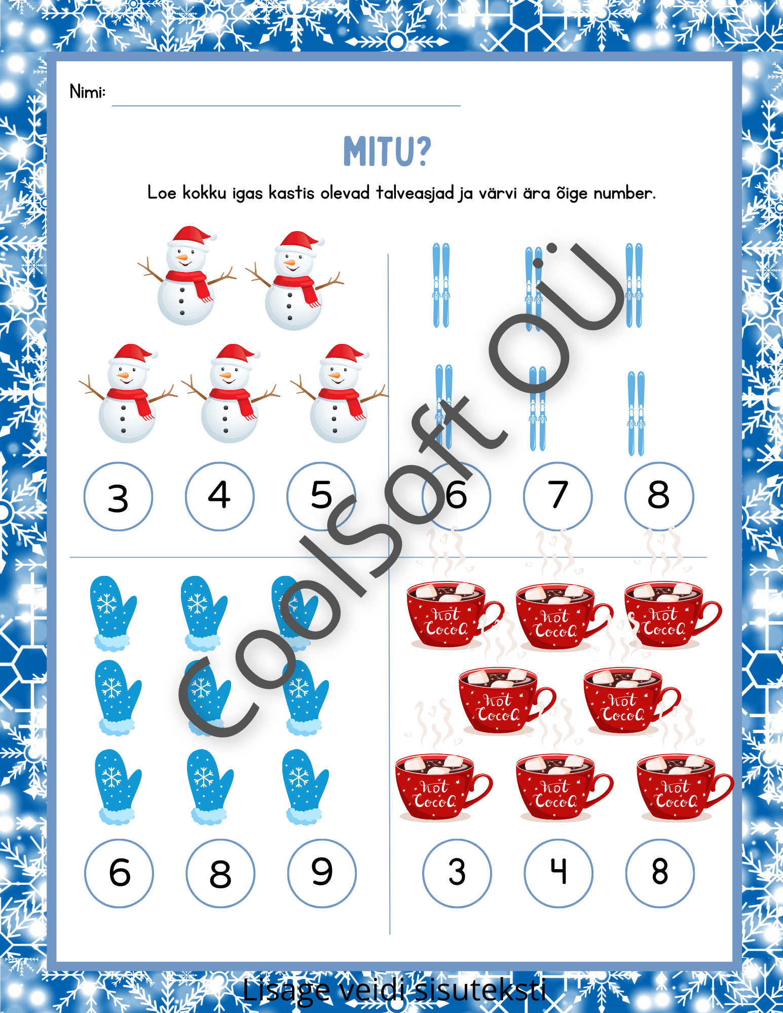 MITU? on talveteemaline matemaatika tööleht, kus laps loendab piltidel olevaid esemeid ja värvib õiged numbrid. ❄️☃️