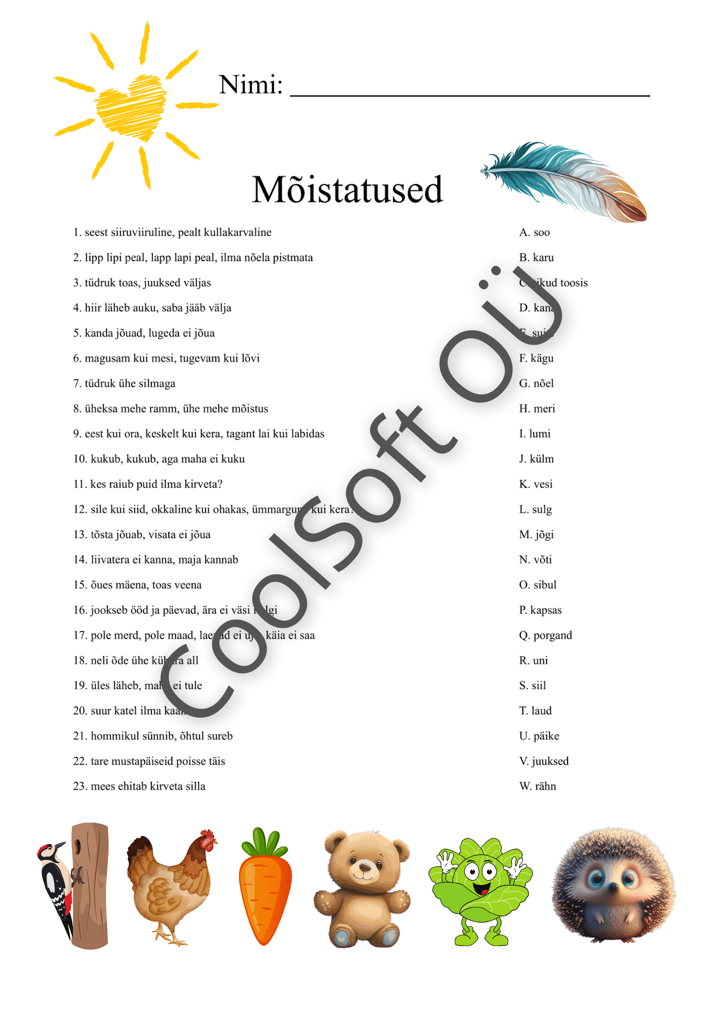 Mõistatused on arendav tööleht, kus laps loeb mõistatusi ja seob need õigete vastustega. Ülesanne arendab lugemisoskust, loogilist mõtlemist, sõnavara ning arusaamist kujundlikust keelest. 🧠📖