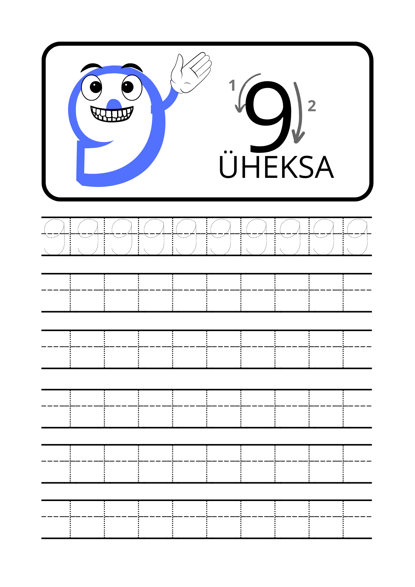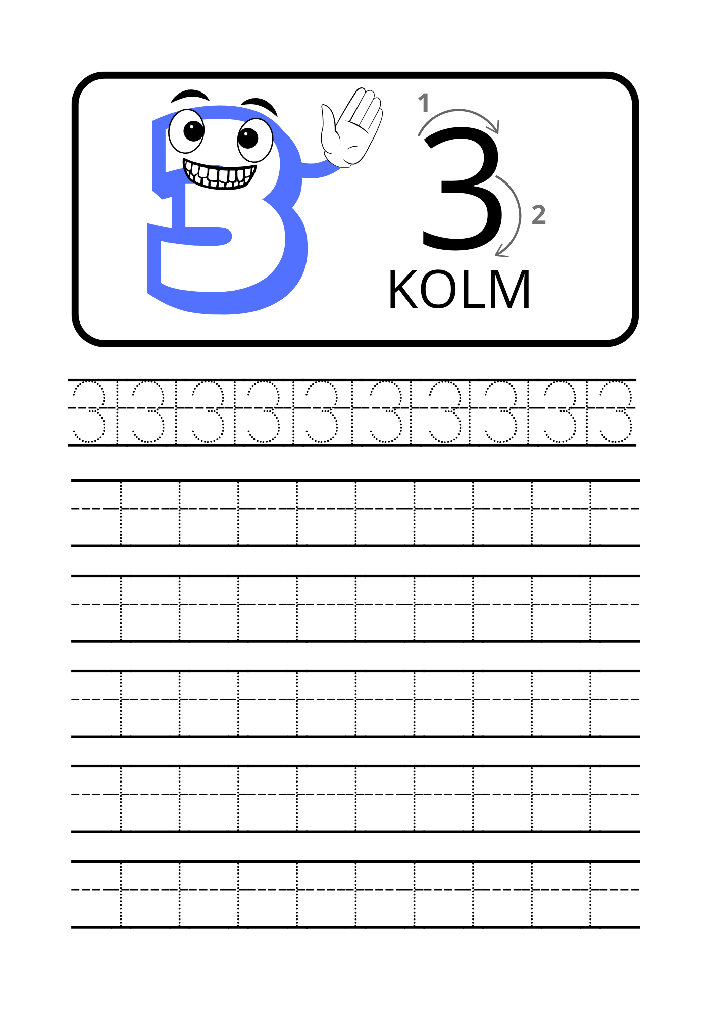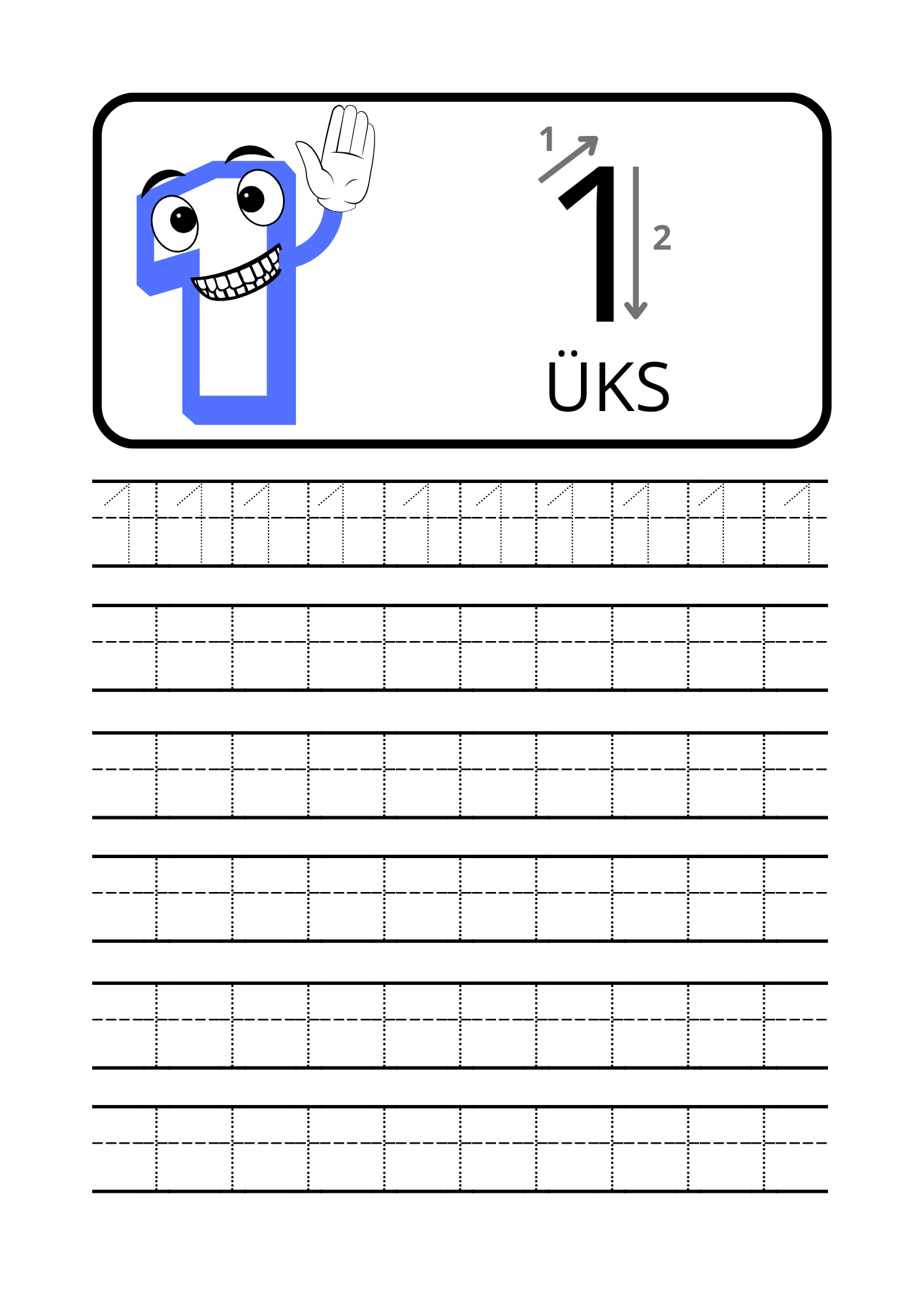 Iga number on esitatud eraldi lehel, kus on selged juhised, suunanooled ning harjutusjooned numbri korduvaks kirjutamiseks. Sõbralik tegelaskuju muudab õppimise mänguliseks ja motiveerivaks.
