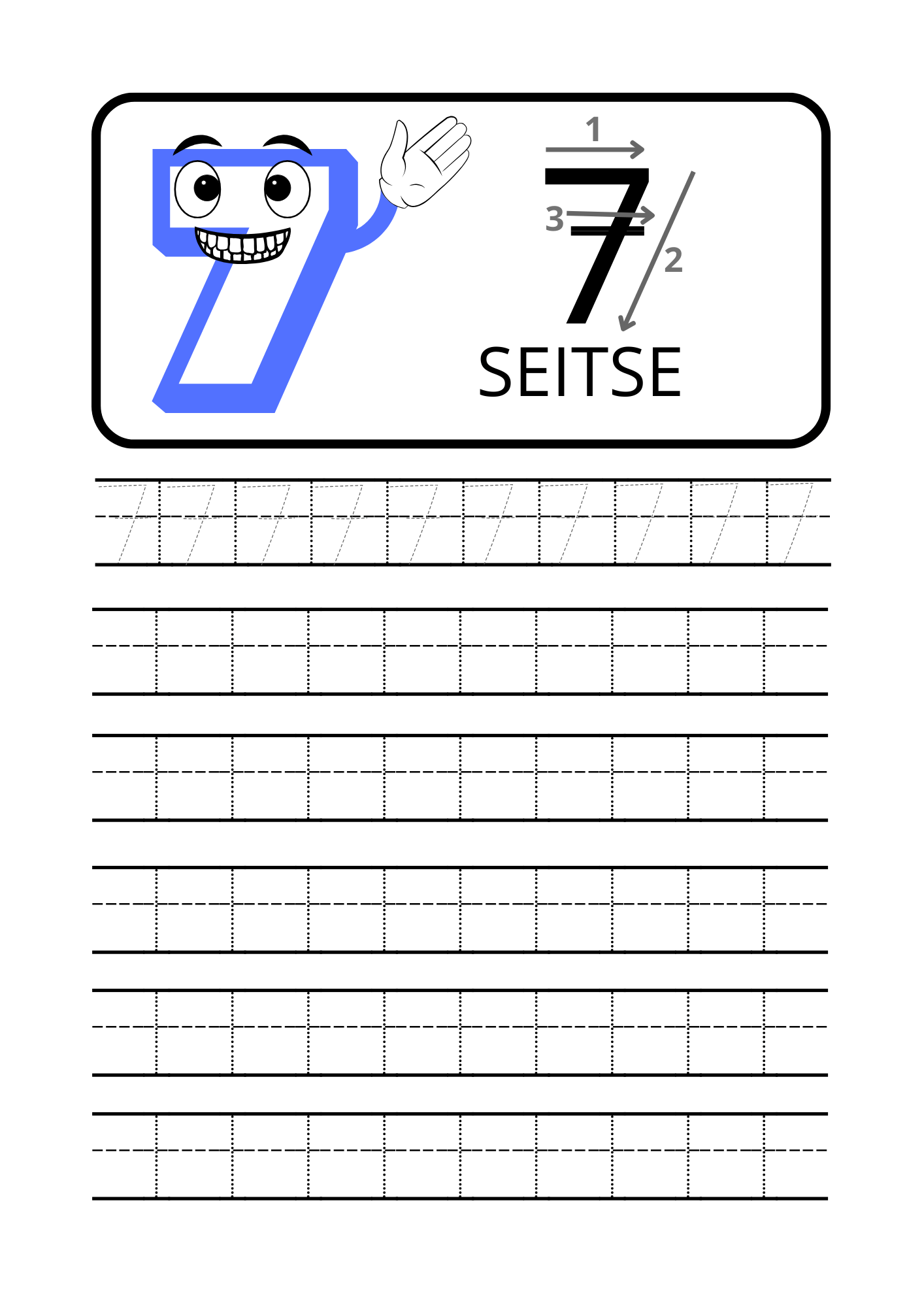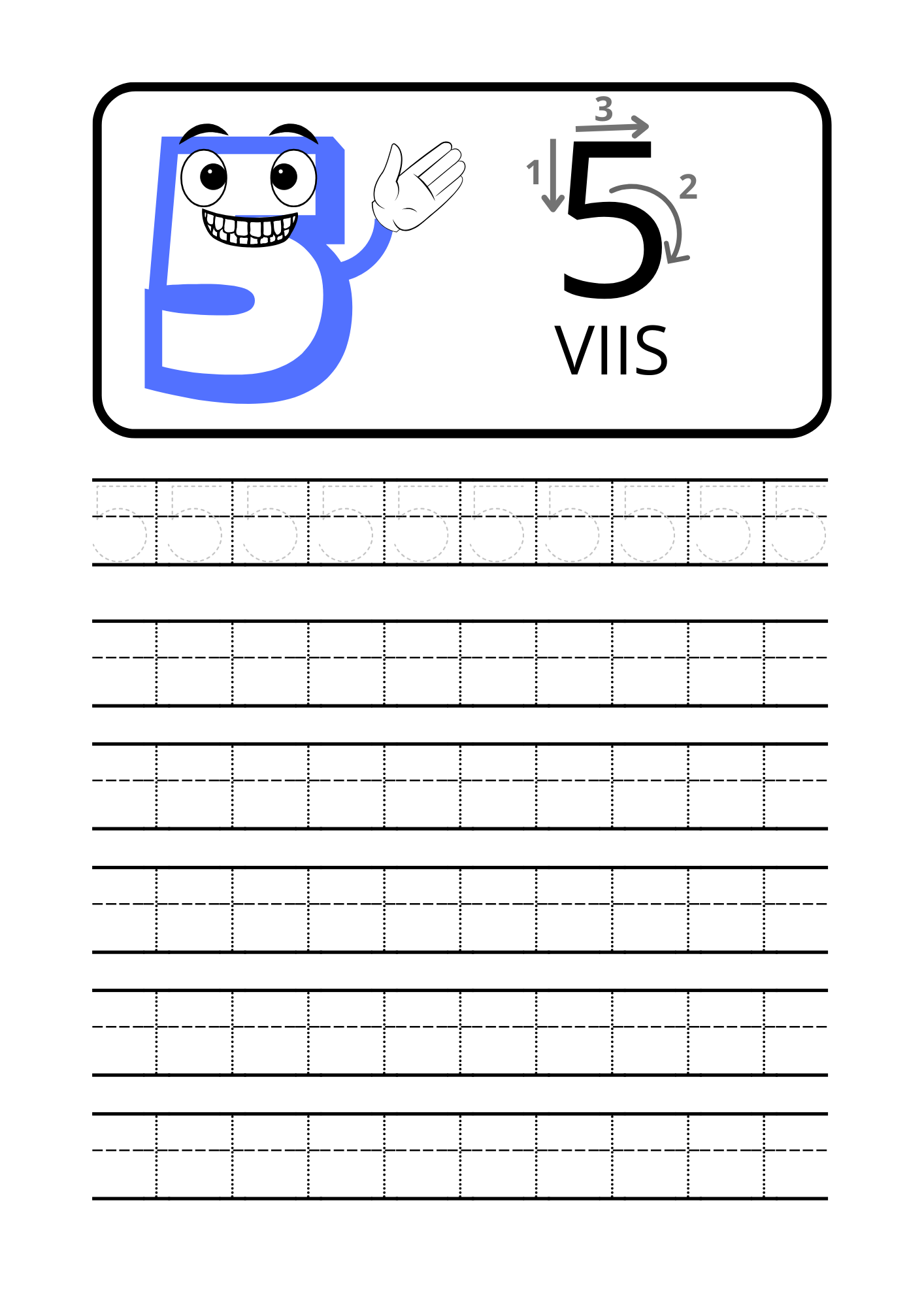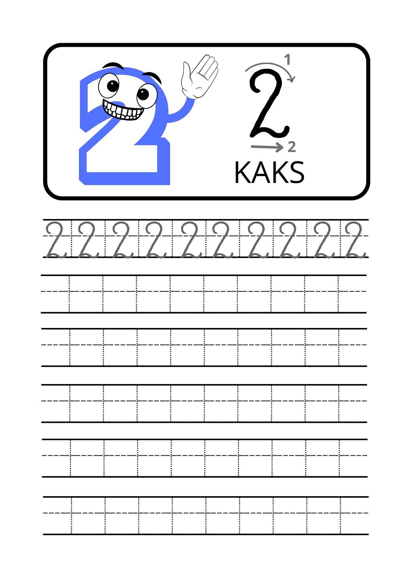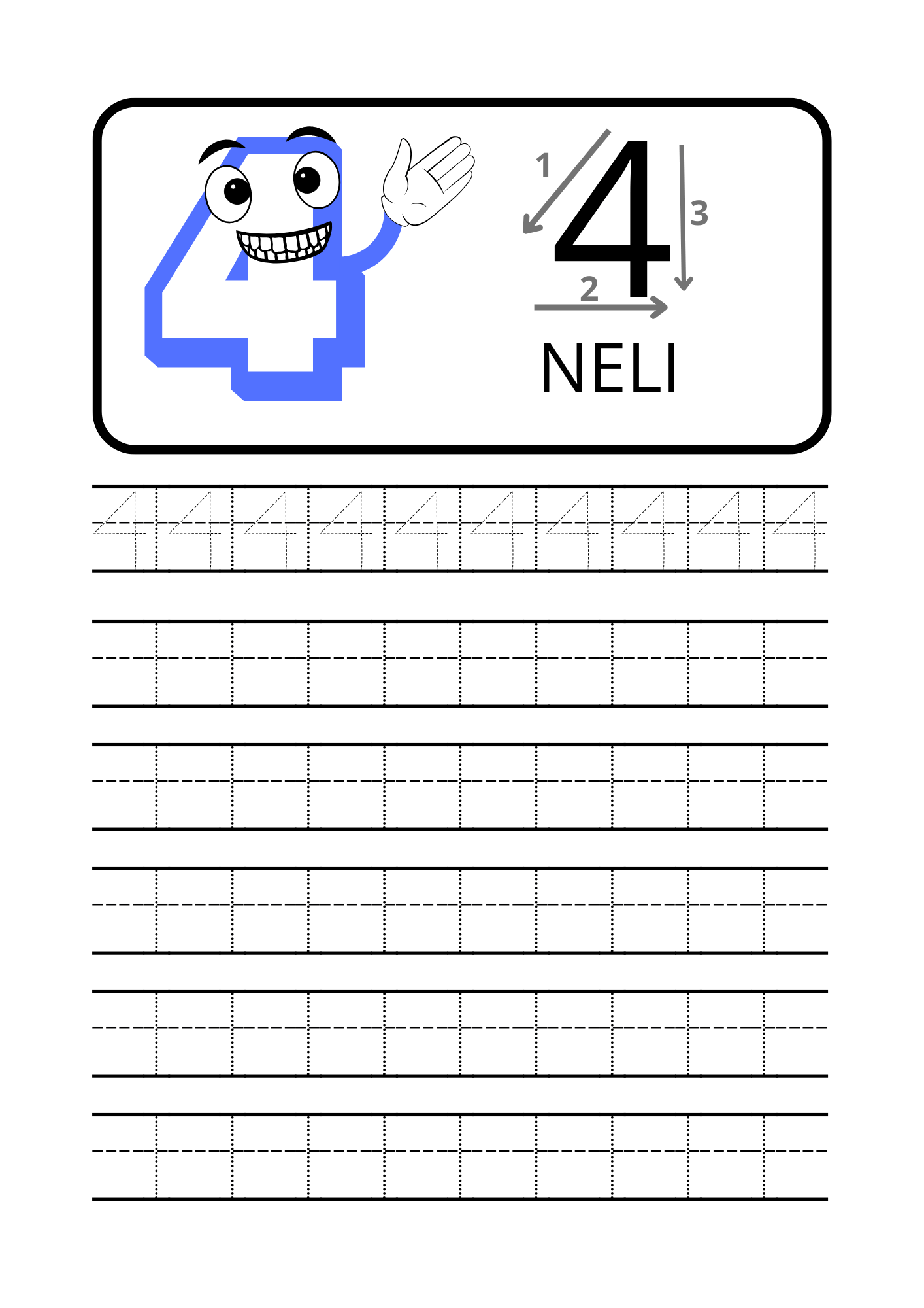 Iga number on esitatud eraldi lehel, kus on selged juhised, suunanooled ning harjutusjooned numbri korduvaks kirjutamiseks. Sõbralik tegelaskuju muudab õppimise mänguliseks ja motiveerivaks.