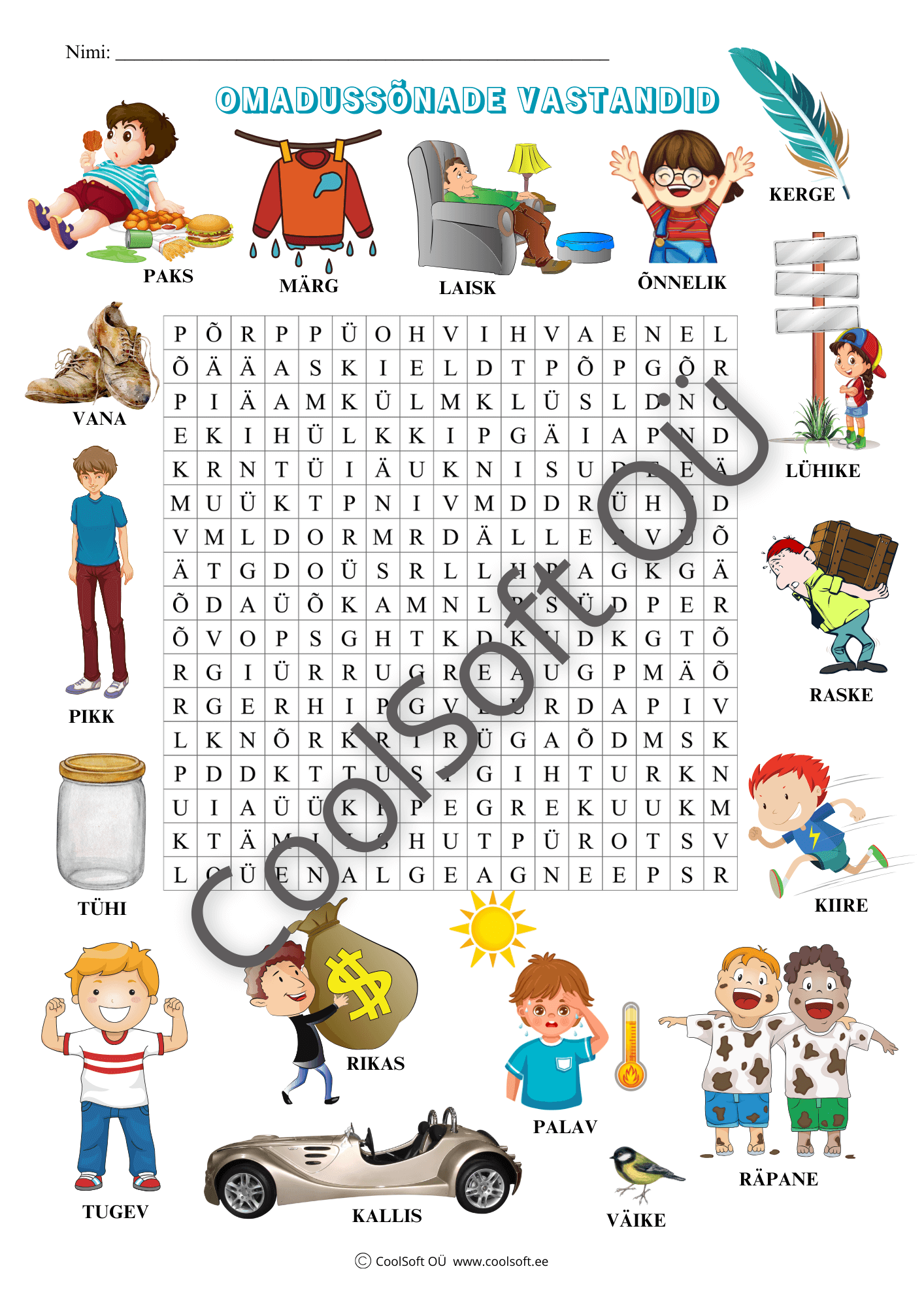 Omadussõnade vastandid on keeleõpet toetav tööleht, kus lapsed otsivad sõnavõrgust omadussõnade vastandpaare. Ülesanne aitab mõista, kuidas sõnade tähendus võib muutuda vastupidiseks. 📚✨