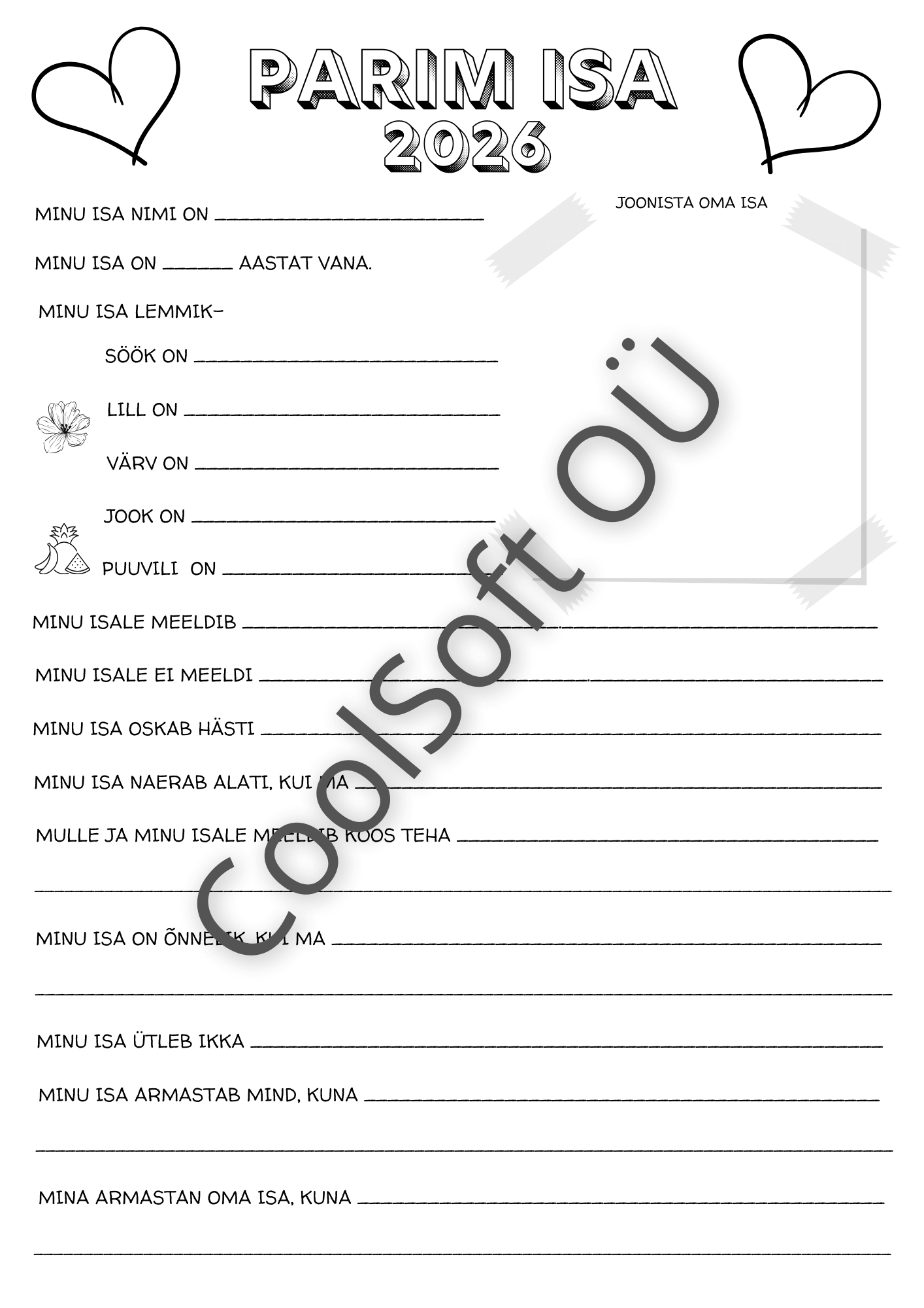 Parim isa 2026 on südamlik tööleht, kus laps mõtleb oma isa peale ja kirjutab temast isiklikke, rõõmsaid ja tähendusrikkaid vastuseid.