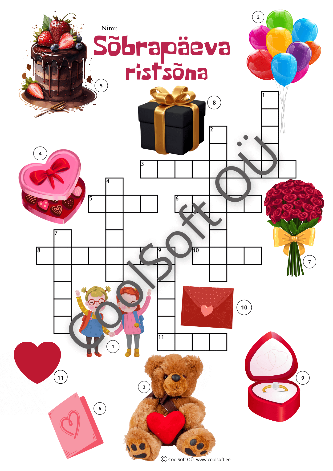 Ristsõnas on kasutusel järgmised sõnad: sõber, õhupallid, mängukaru, kommid, tort, kaart, lilled, kingitus, sõrmus, kiri, süda.