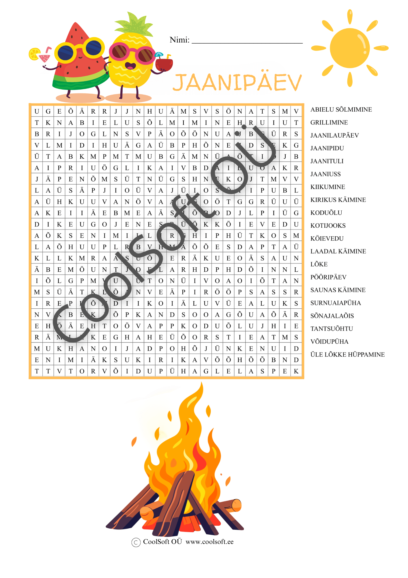 Jaanipäev on suvine ja rõõmsates toonides sõnaotsingu tööleht, mis tutvustab lapsele jaanipäevaga seotud tegevusi, kombeid ja sõnavara. 🔥🌞🍉