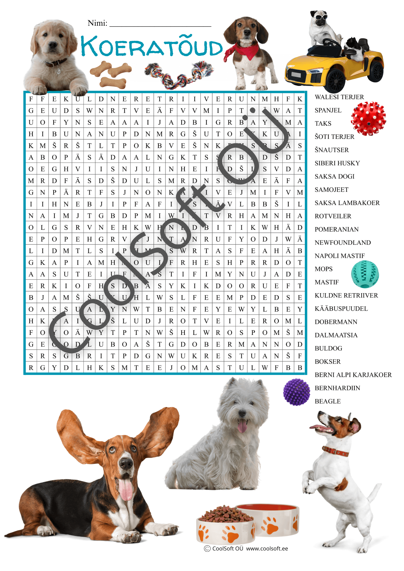 Koeratõude sõnaotsing on lõbus ja hariv tööleht, mis aitab lapsel õppida tundma erinevaid koeratõuge mängulisel viisil. Laps otsib tähepuslest üles tuntud ja vähem tuntud koeratõugude nimetused ning arendab samal ajal tähelepanu, sõnavara ja lugemisoskust. 🐶