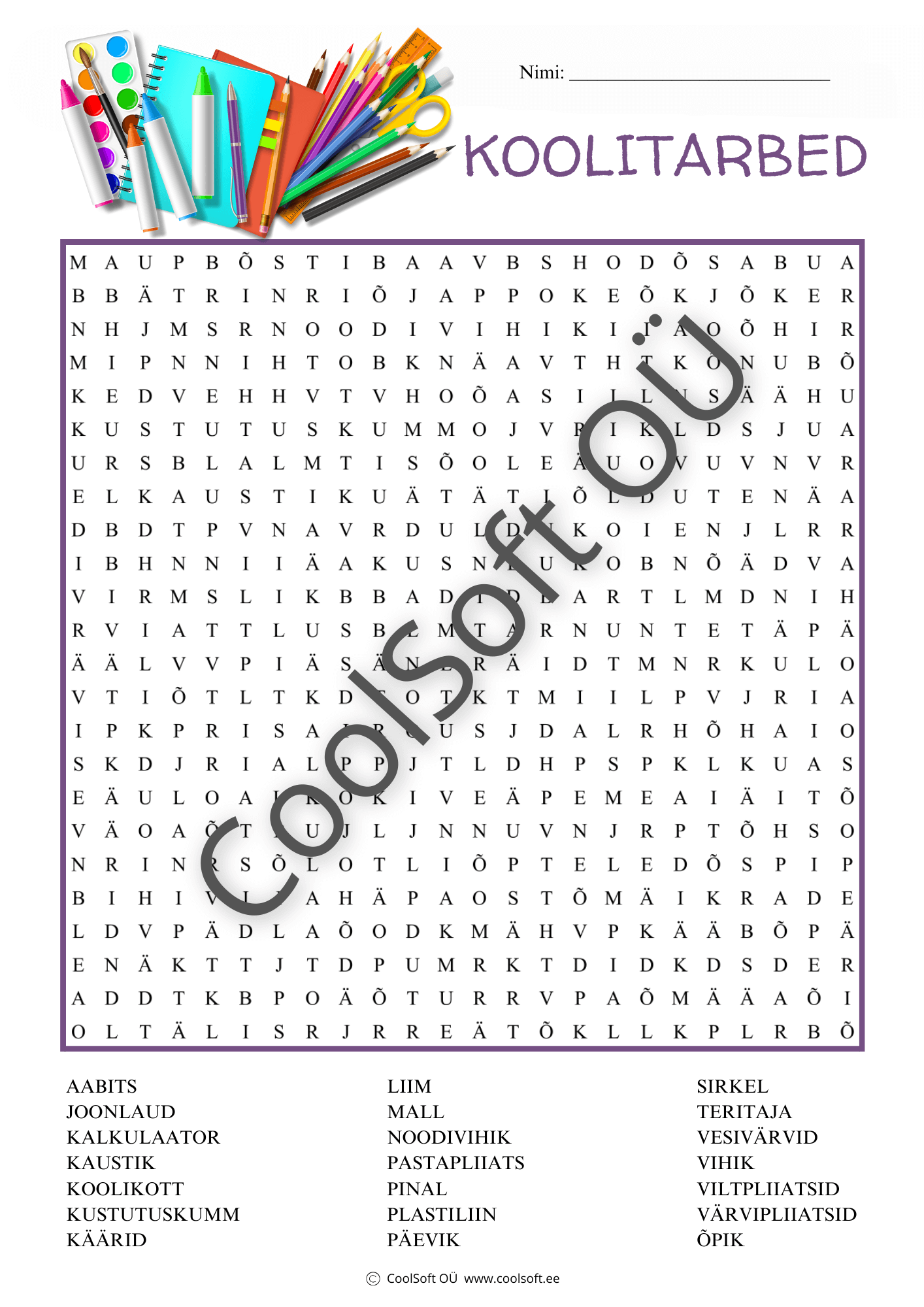 Koolitarbed on hariv ja mänguline sõnaotsingu tööleht, kus laps otsib tähehulgast erinevaid koolitarbeid. ✏️📚