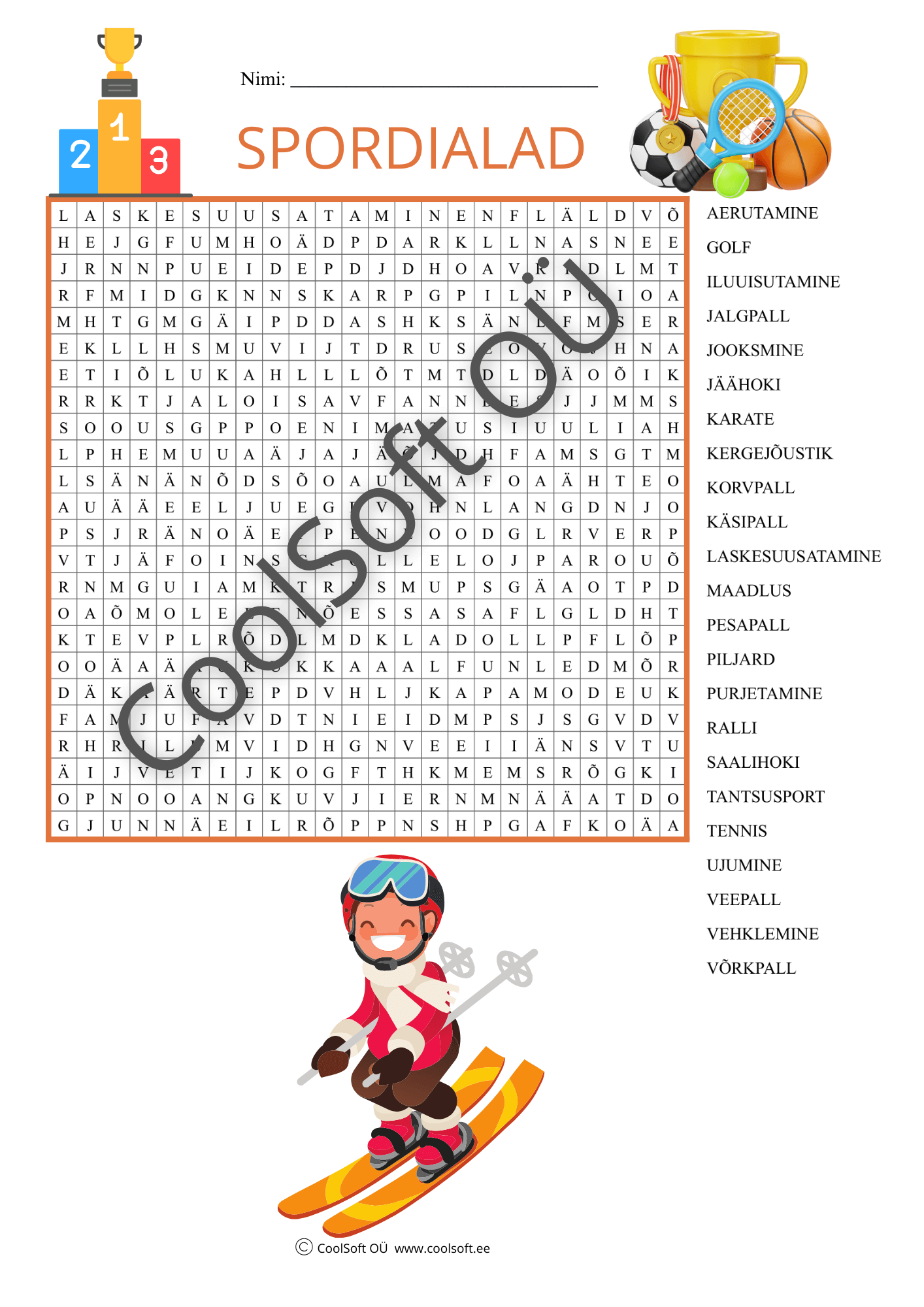 Spordialade teemaline sõnaotsingu tööleht aitab lapsel tutvuda erinevate spordialade nimetustega ning arendada tähelepanu, lugemisoskust ja visuaalset eristamisvõimet. Laps otsib täheväljast spordialade nimetusi ning seob need paremini meeldejäävate illustratsioonidega. 🏆⚽