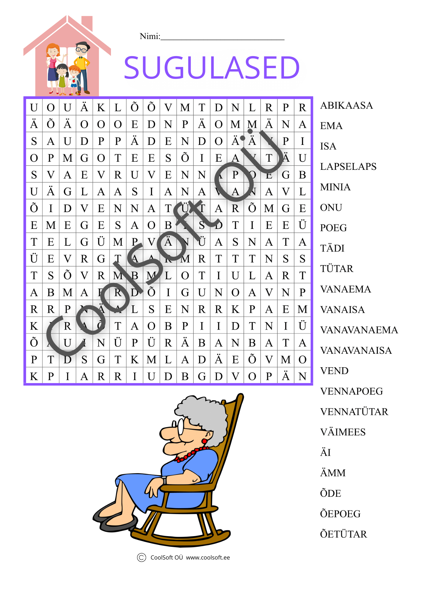Sugulaste sõnaotsingu tööleht aitab lapsel õppida tundma perekonna- ja sugulussuhteid. Laps otsib täherägastikust sugulaste nimetusi ning seob sõnad igapäevaelust tuttavate mõistetega. 👨👩👧👦💜