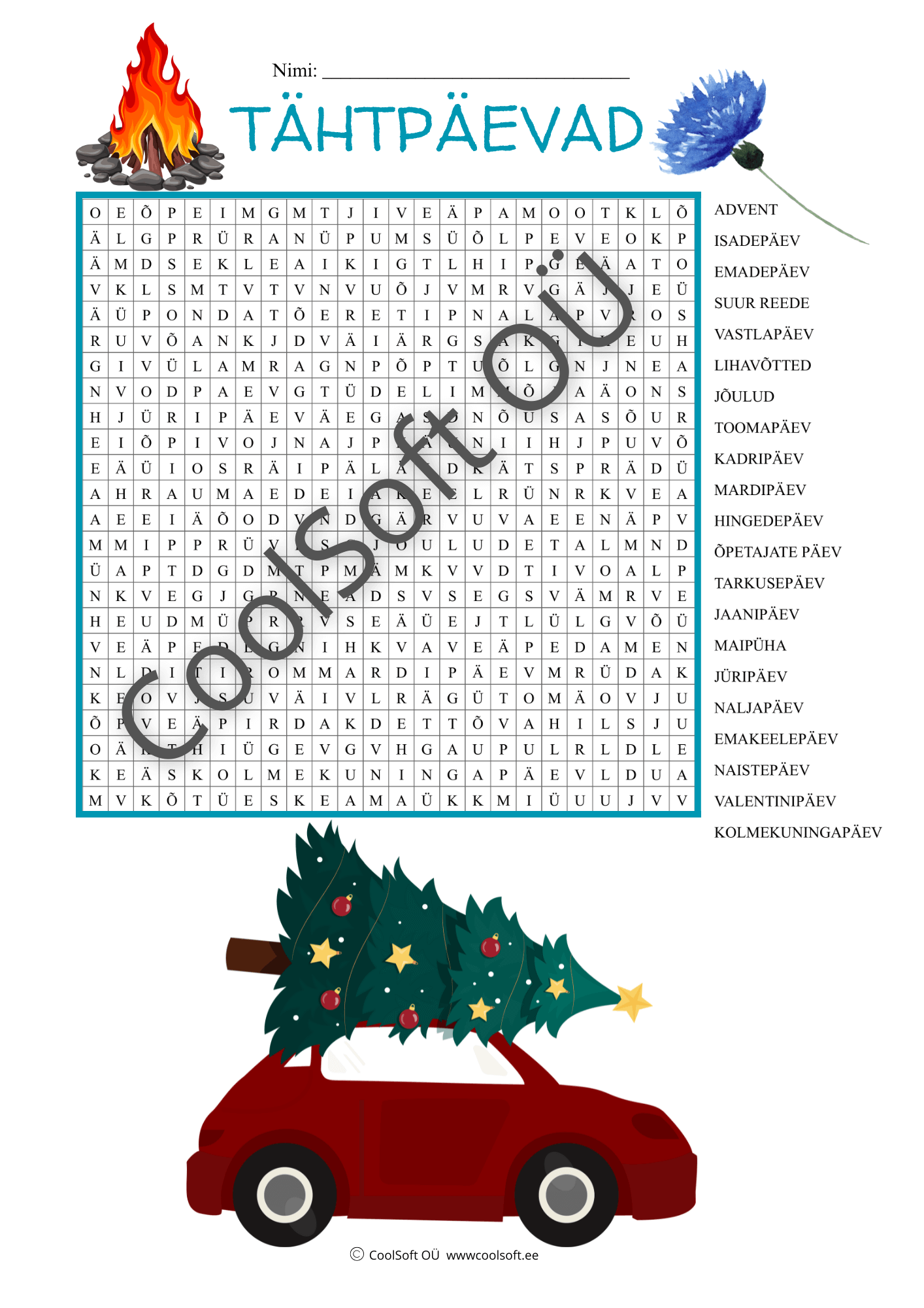 Tähtpäevad on mänguline ja hariv sõnaotsingu tööleht, mis aitab lastel tutvuda Eesti ja rahvusvaheliste tähtpäevadega. 🎄🔥