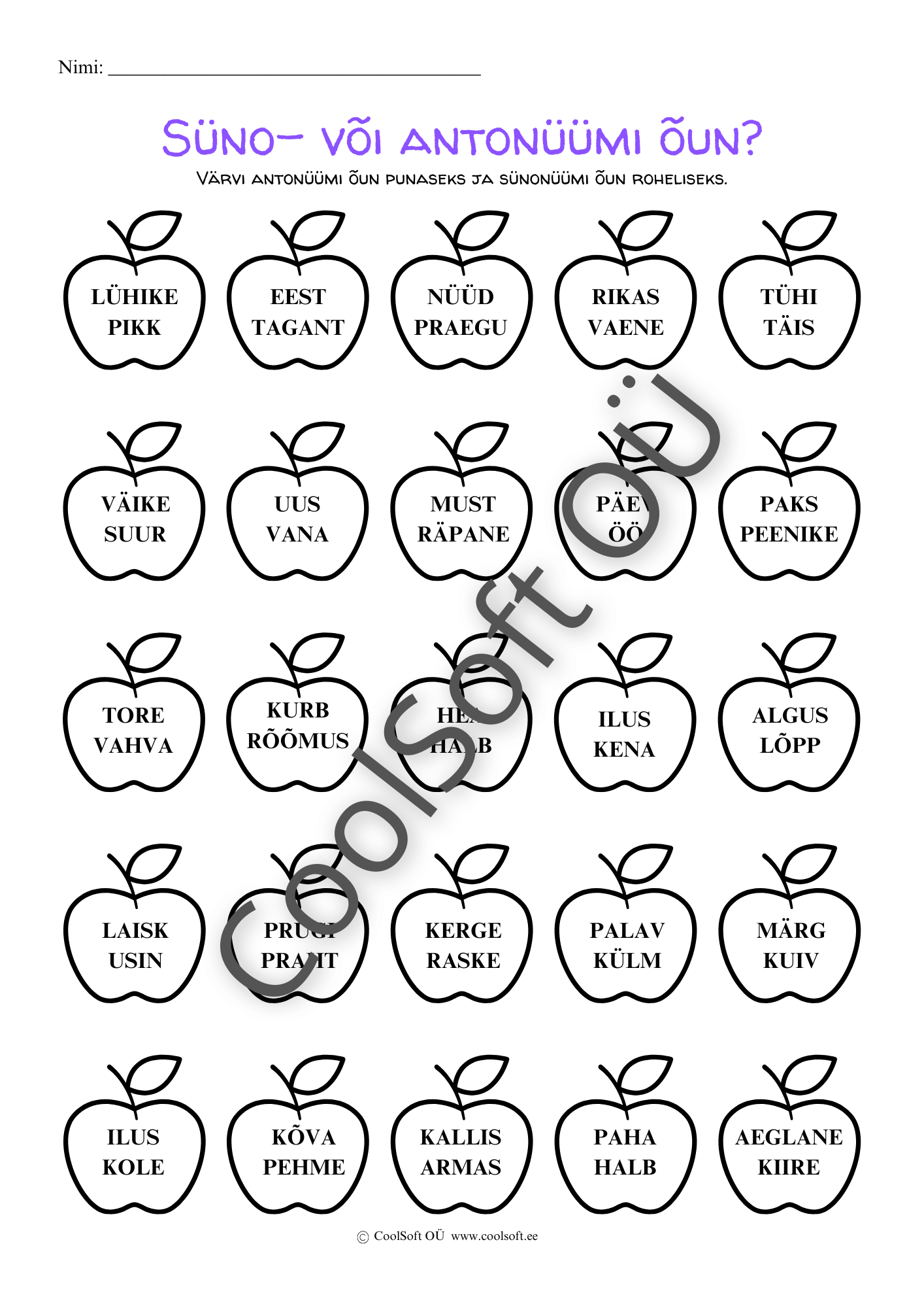 Töölehel kujutatud õuntel on kirjas sõnapaarid. Kui õunal kirjas oleva sõnapaari puhul on tegemist sünonüümiga, tuleb õun värvida roheliseks ning kui õunal kirjas oleva sõnapaari puhul on tegemist antonüümiga, tuleb õun värvida punaseks. Piltide abil saab lapsele õpetada süno- ja antonüümi olemust ja erinevust.