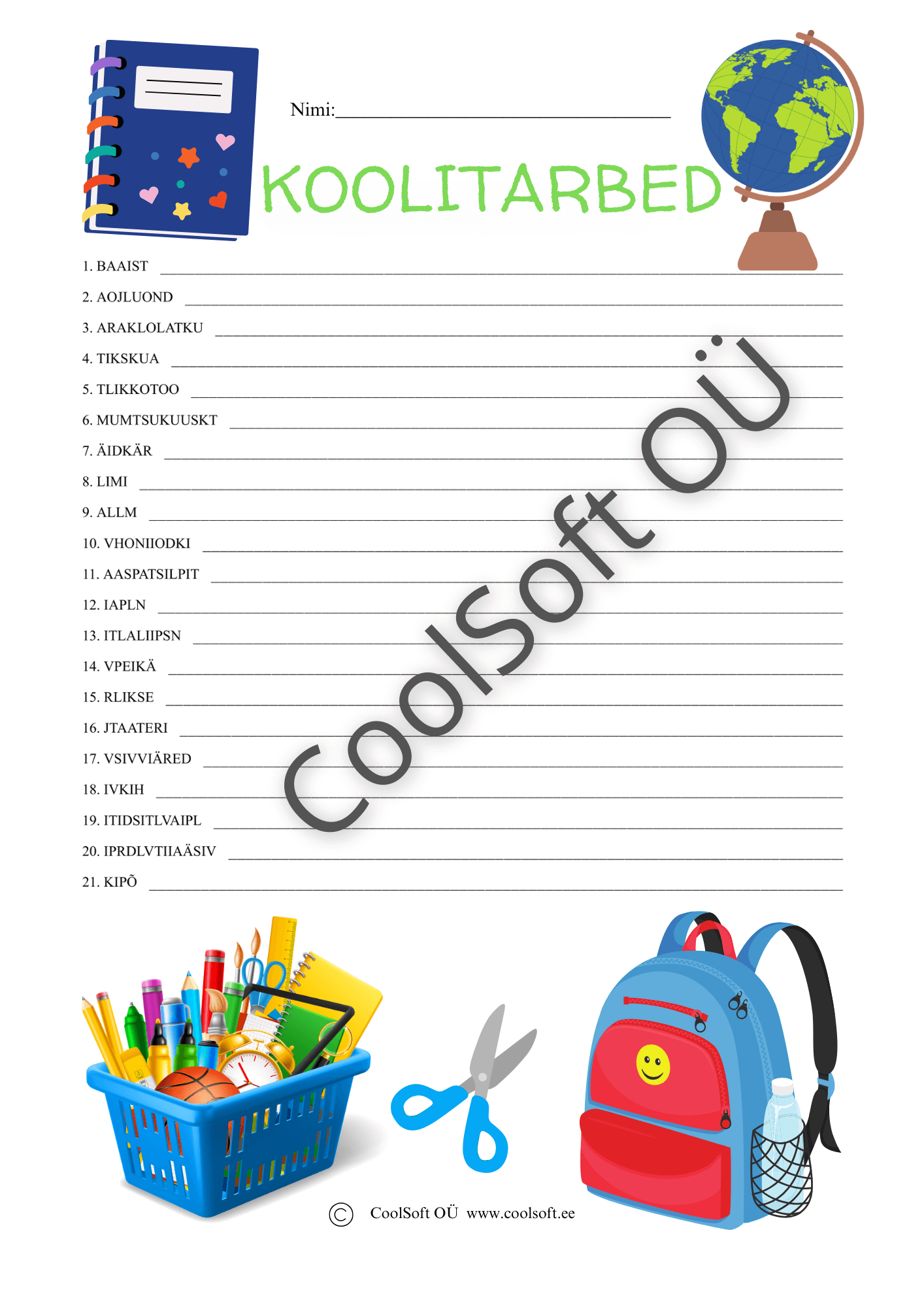 Koolitarbed on praktiline ja arendav sõnade moodustamise tööleht, kus laps korrastab segamini tähed ning kirjutab neist õiged koolitarvete nimetused. Ülesanne aitab kinnistada igapäevaelust tuttavat sõnavara ning arendab lugemis- ja õigekirjaoskust. ✏️🎒