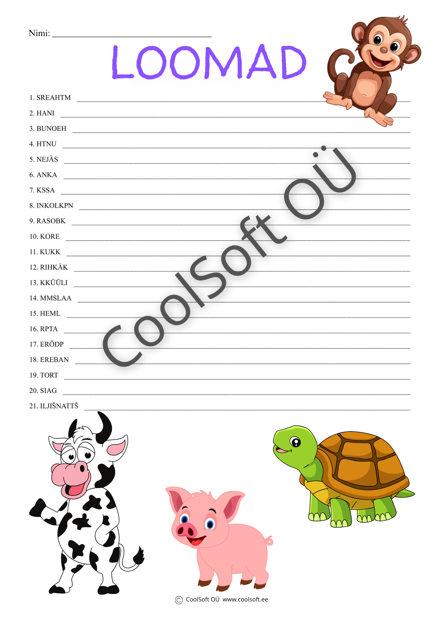 Loomad on arendav ja mänguline tööleht, kus lapsel tuleb segamini aetud tähed õigesse järjekorda panna ning moodustada loomade nimetused.